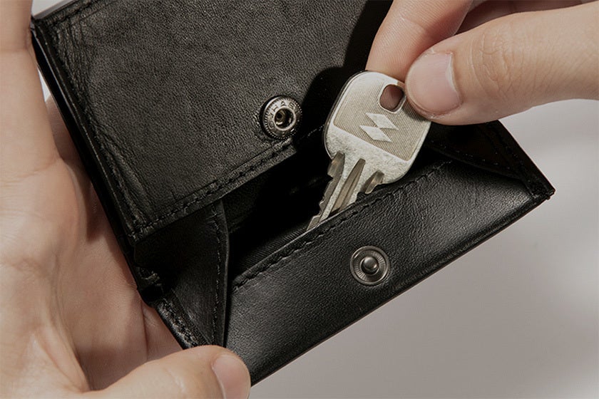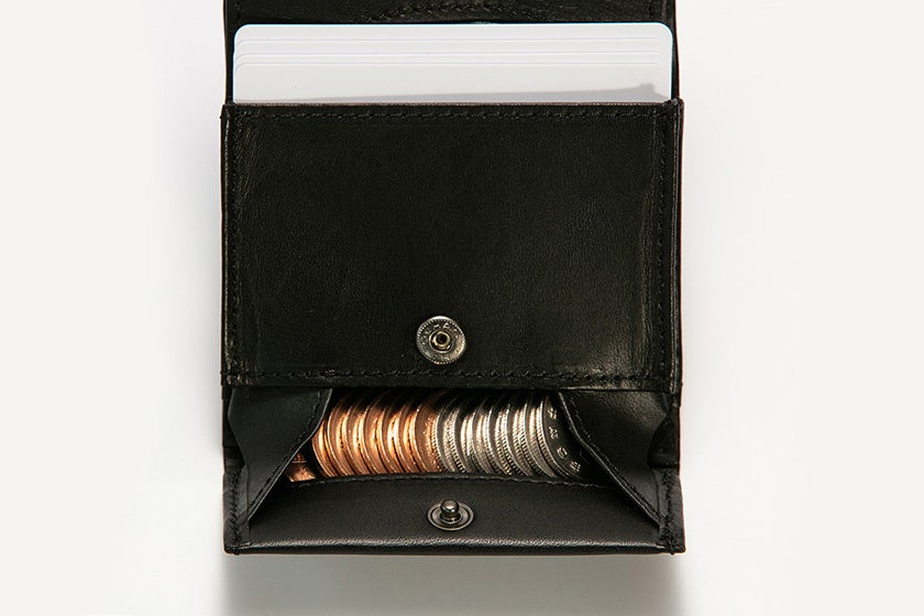 余分なスペースを徹底的に削ぎ落してデザイン。パンツのポケットにもすっきり収まる約9cm角のサイズです。コシの強い芯材入りの構造は、小銭が増えても膨らみにくく、薄さをキープします。