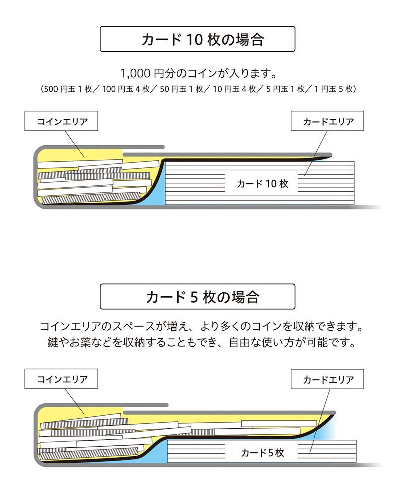 コインエリアはすべり台のような構造です。財布を傾けるだけでスマートに出し入れできます。 カード10枚が入った状態で、充分な枚数のコイン(1000円分)を収納。カードを減らせば、空いたスペースにさらに多くのコインを収納できます。