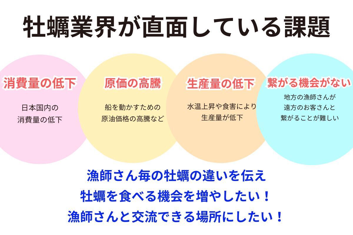 しかし、今のままでは資金面で活動の継続が難しく、牡蠣の魅力を伝えるための新しい取り組みに挑戦する事が難しい状況です。そこで、今回クラウドファンディングに挑戦することを決意しました。