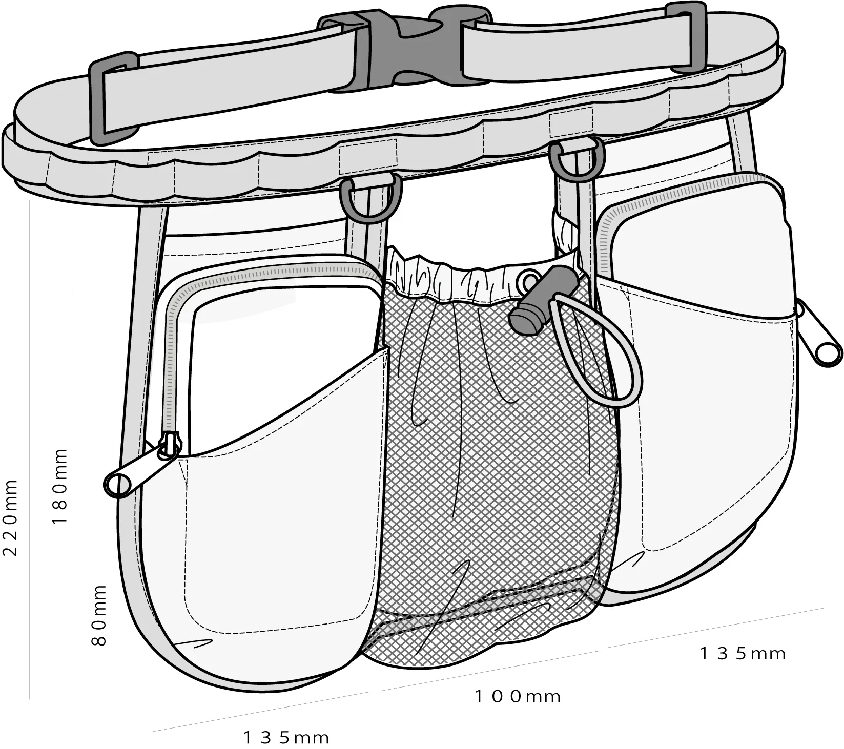 3つの独立したポケットを備えており、着用時の圧迫感を軽減します。一体型の製品では動きにくさを感じることがありますが、各ポケットが動きに合わせて独立して動くため、ウエストベルト内側の伸縮性のある補助ゴムと合わせて、快適な使用感を提供します。また、左右対称の構造であるため、どちらの手でも使いやすく、単なるバッグとしてだけでなく、トリーツポーチとしても活用できます。※使用時は必ず袋などに入れてください。