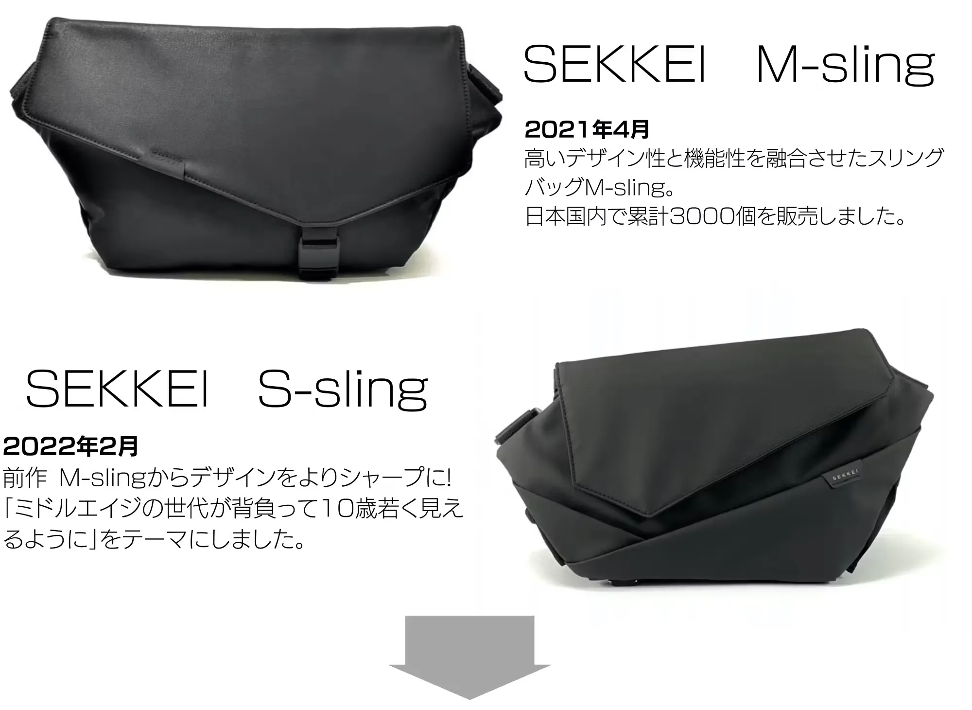 そして前作 SEKKEI M-sling の販売から1年、皆様のご意見、ご要望を反映して、よりスタイリッシュに「背負ったミドル世代の背中が10歳若く見えるように」をコンセプトに2022年6月に SEKKEI S-sling を発表しました。