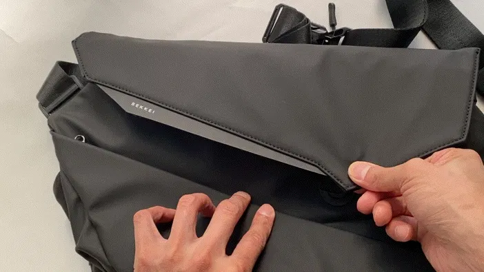 この隠しポケットも前作 S-sling からそのまま踏襲しました。実用的な機能、ただそれだけにするのも面白くありませんでした。やはり「カッコいい」というコンセプトは大事にしたいので、この収納にはフラットマグネットを採用しました。スタイリッシュなデザインという路線は崩していません。