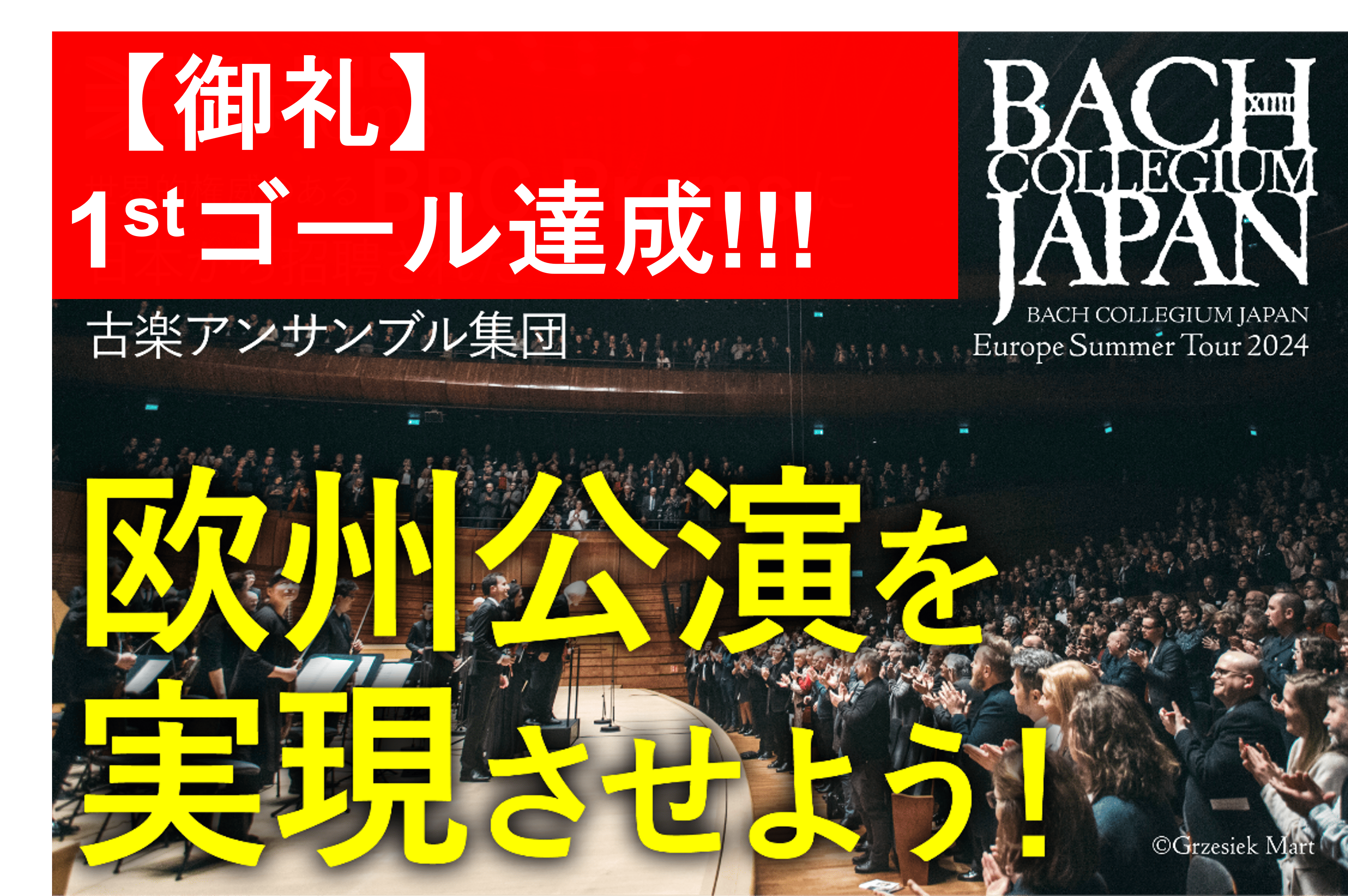 2024/07/09 02:54みなさまの温かいご支援により、開始2日目にして1stゴールの100%を達成いたしました!!本当に、どうもありがとうございます!!この短期間で目標達成できたことに驚くと同時に、みなさまからの大きな期待に応えるべく、更に頑張ってまいります。ネクストゴール200%を達成した暁には、【支援者様限定の欧州ツアー帰国報告会※】を感謝の気持を込めて開催いたします!!ご支援を受けて、欧州ツアー中の活動や出来事をシェアしたいと思います。※YouTube限定配信予定。皆さま一人ひとりからのご支援やメッセージが、大変励みになっております。ネクストゴール200%達成に向け、知人の方への共有や、campfireでの「お気に入り」登録をしていただけますと幸いです。(検索上位に表示されるようになります)引き続きご支援を頂けましたらば幸いです。重ねまして、お礼申し上げます!Bach Collegium Japan もっと見る