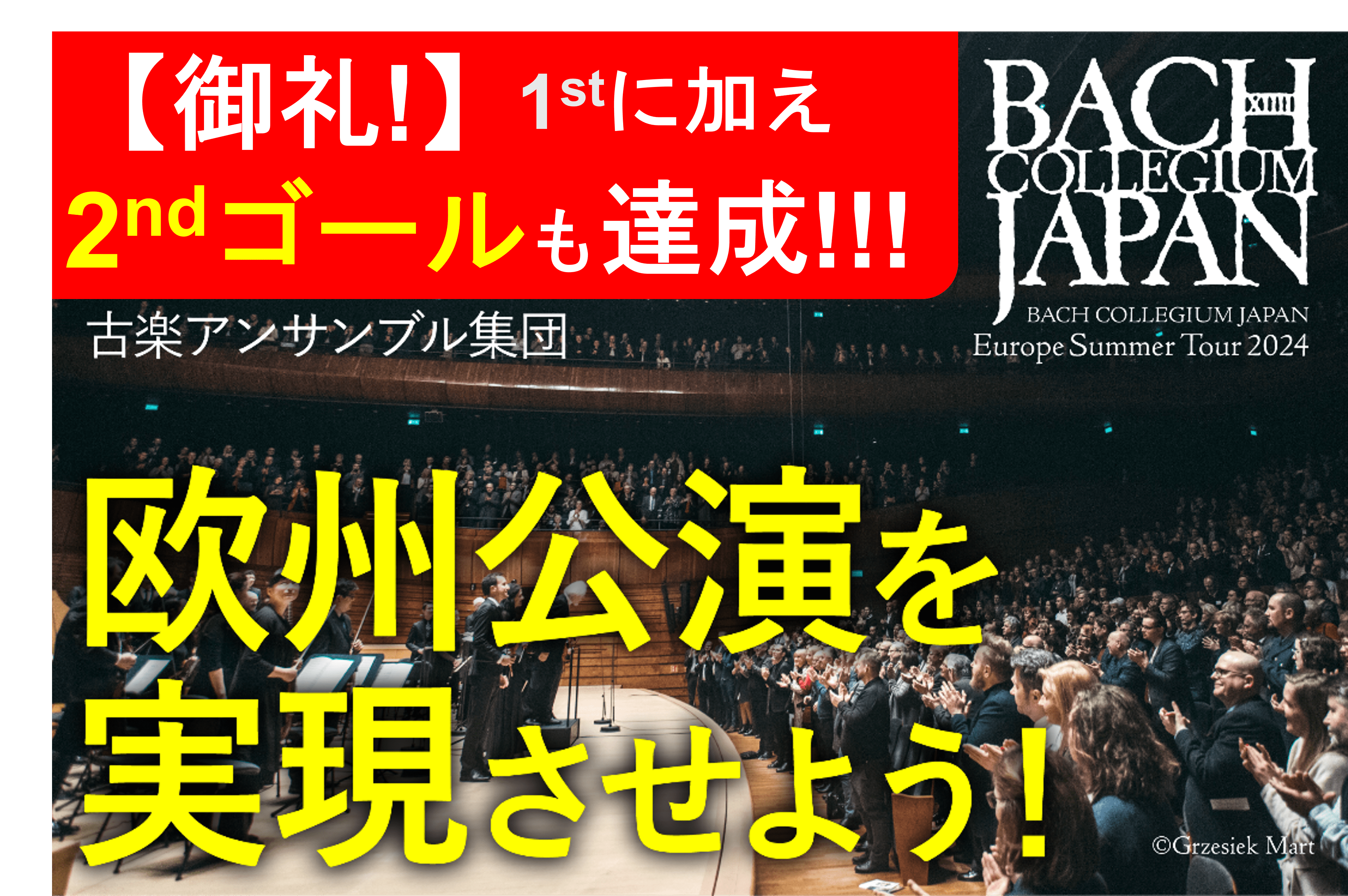 2024/07/10 21:20ご支援くださったみなさまみなさまの温かいご支援により、開始2日目にして1stゴールの100%を、そして3日目には2ndゴールの200%を達成いたしました!みなさま、心よりどうもありがとうございます!!!200%達成に伴い、クラファン開始当初よりお約束に掲げておりました【支援者様限定の欧州ツアー帰国報告会】の実施を決定しました!!YouTubeで限定配信の予定です。そして、次の3rdゴールの300%を達成できた際には、さらなる豪華企画も計画中です.....!詳細は近日発表いたします!!ここからは本題。200%や300%を達成したとしても、それでも欧州ツアーは経済的に実はまだ赤字、というのが現状です。だからこそ、皆さま一人ひとりからのご支援の積み重ねが、私達の演奏活動に本当に役立っていることを、お伝えさせてください。その中、さらなる高みの3rdゴール300%達成に向けて挑戦を続けております。知人の方への共有や、campfireでのお気に入り登録※をいただけますと幸いです。※検索で上位に表示されるようになります。引き続き当楽団をよろしくお願い致します。改めまして、皆さまに心より御礼を申し上げます!!Bach Collegium Japan もっと見る