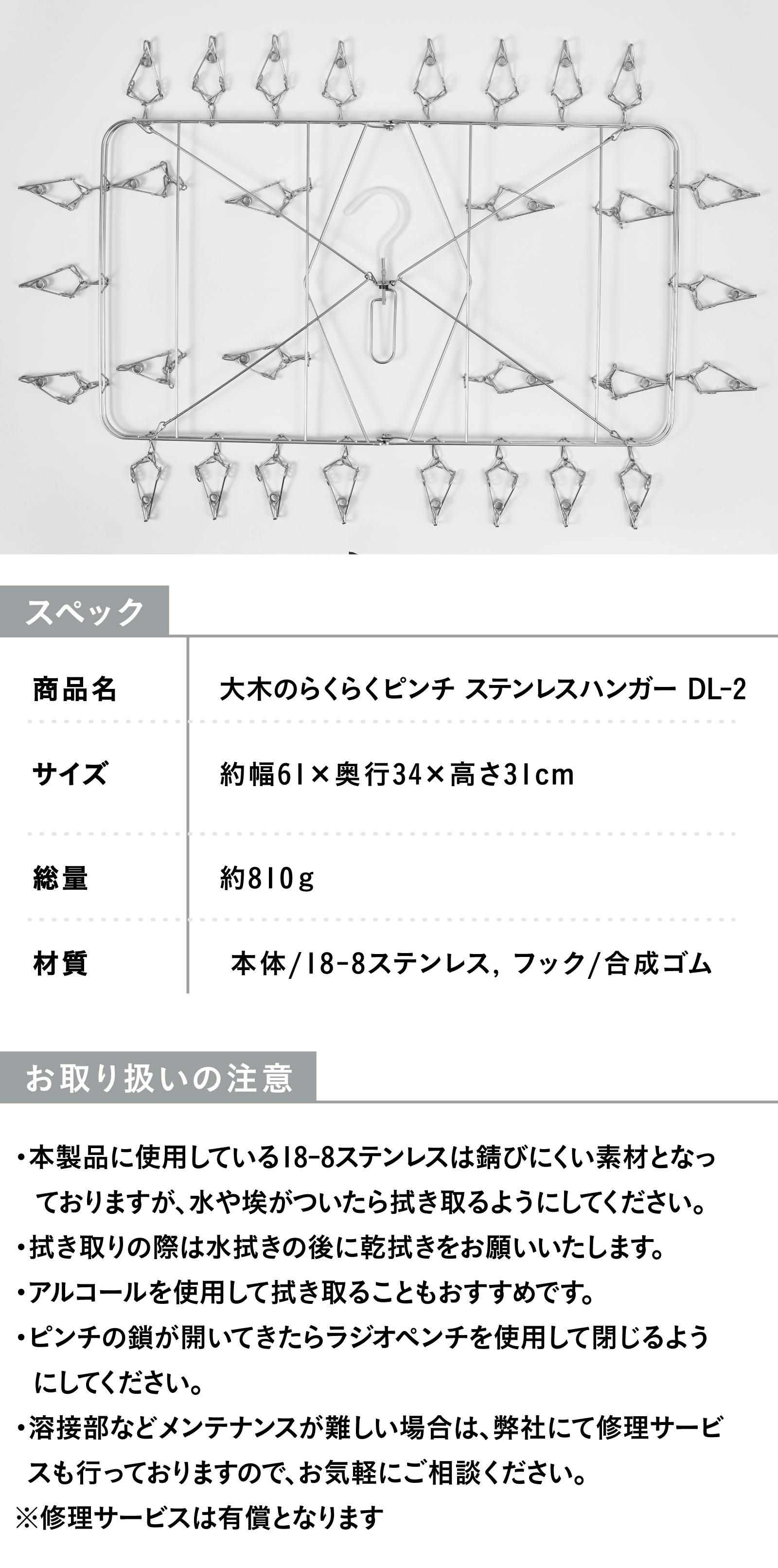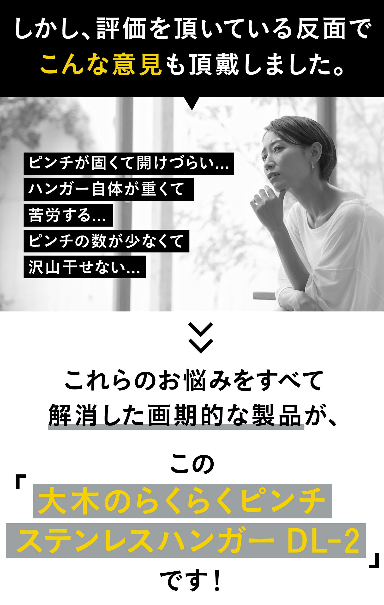 ステンレスハンガーを販売して約30年。より良い使い勝手を追求し、長年多くの方に愛されてきました。この度、グレードアップした「大木のらくらくピンチ ステンレスハンガー DL-2」を販売させていただきます。