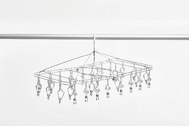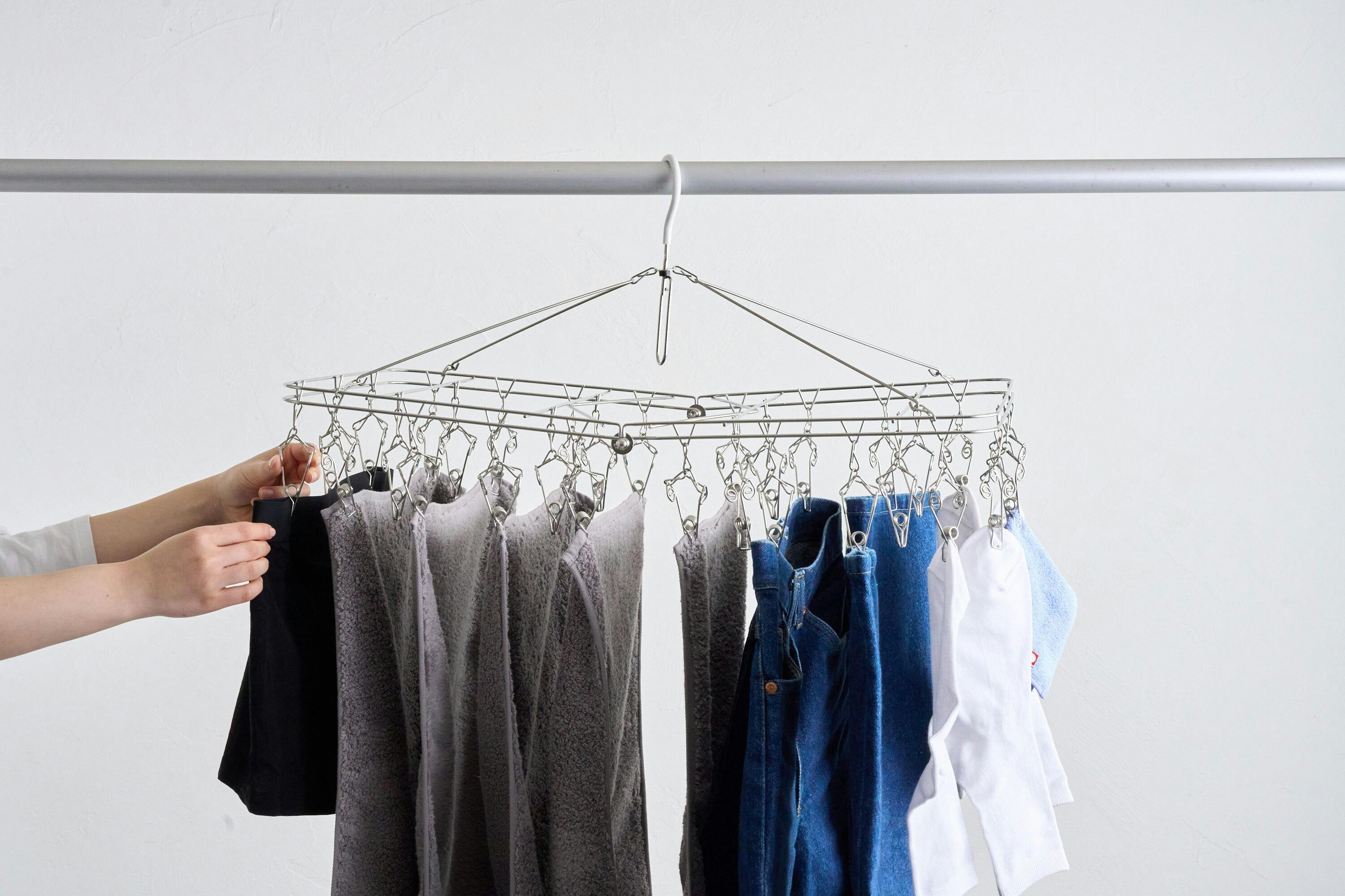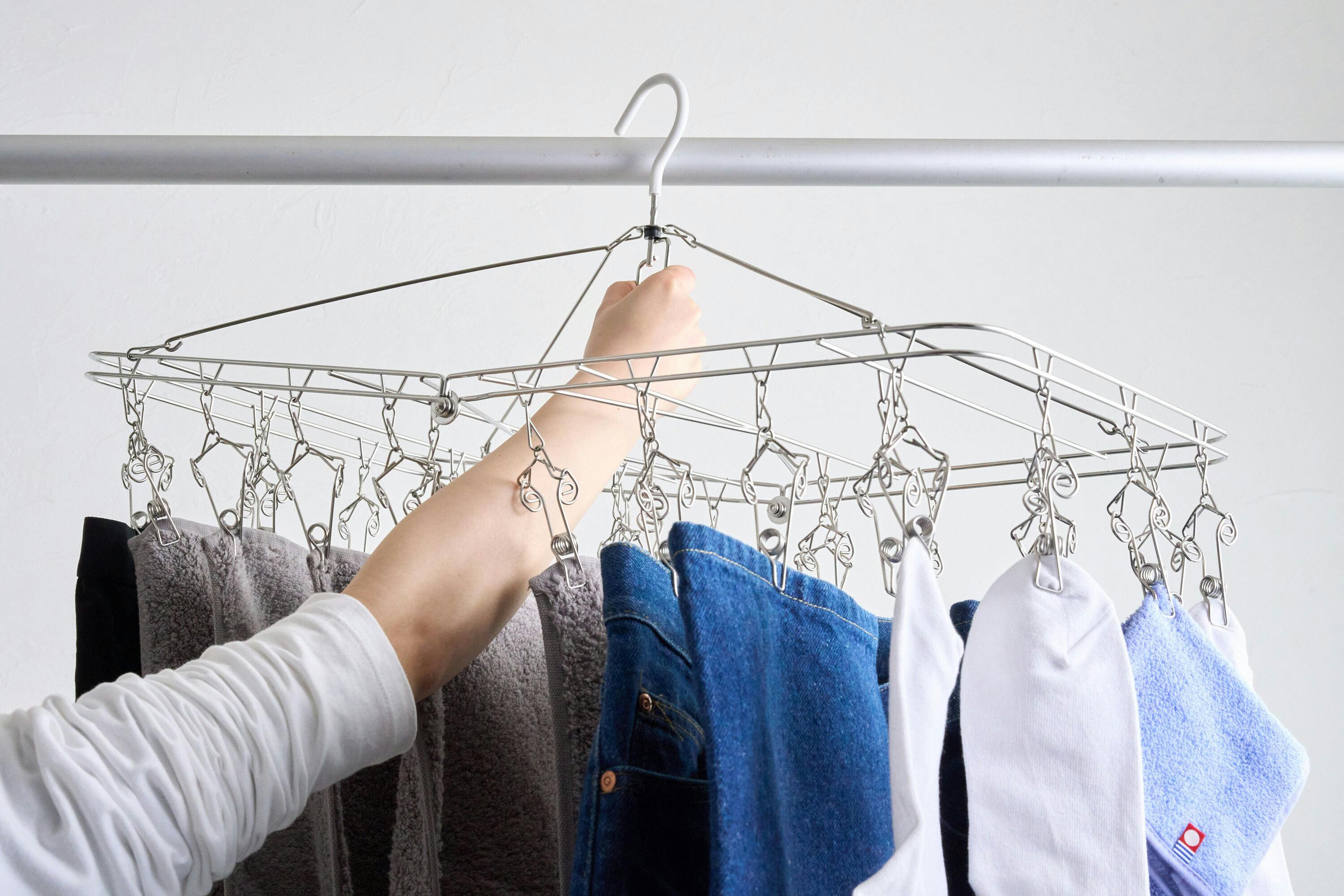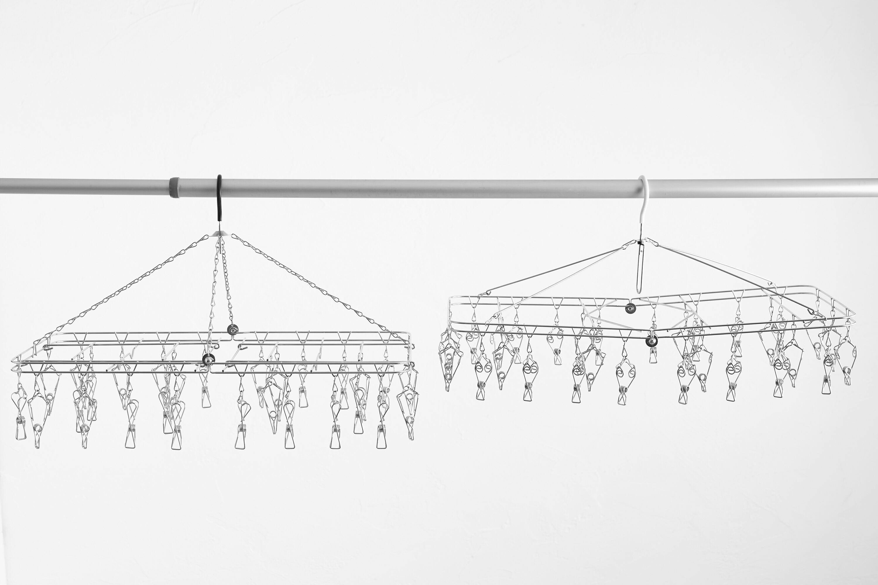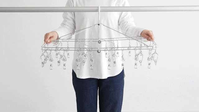 大木のらくらくピンチステンレスハンガーでは、フックの下に持ち手を付け、洗濯物を干したままでもらくらく持ち運べるようになりました!