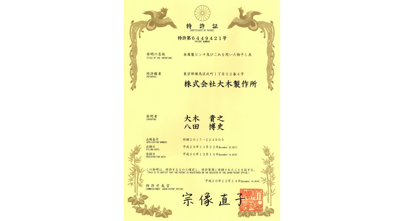 大木製作所は販売当初よりピンチにこだわっており、何度も研究開発を重ねてきました。長い期間を経て完成させたらくらくピンチは、平成30年に特許証を取得いたしました。