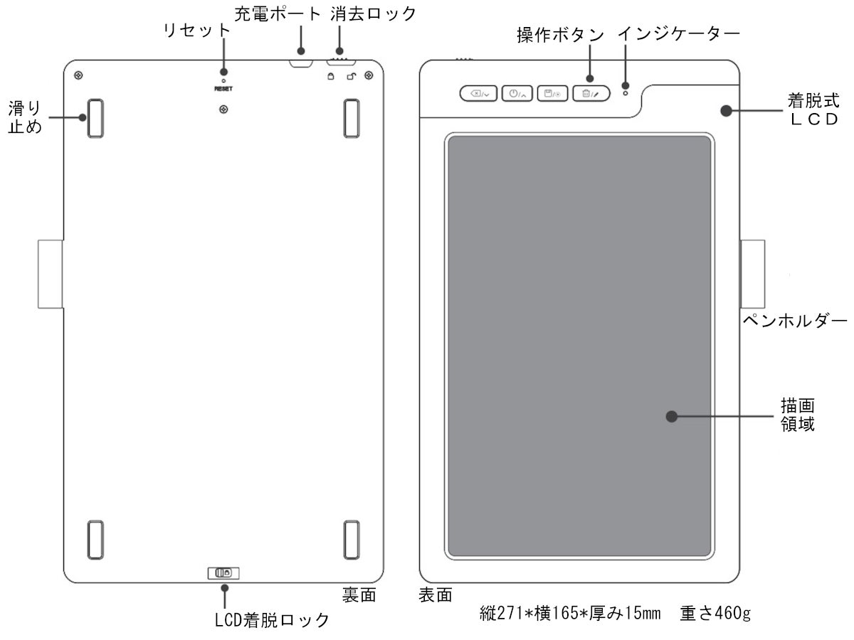 ①2つのLCDを使い分けて書くことが出来ます。本体に差し替えることで消去が可能となります。