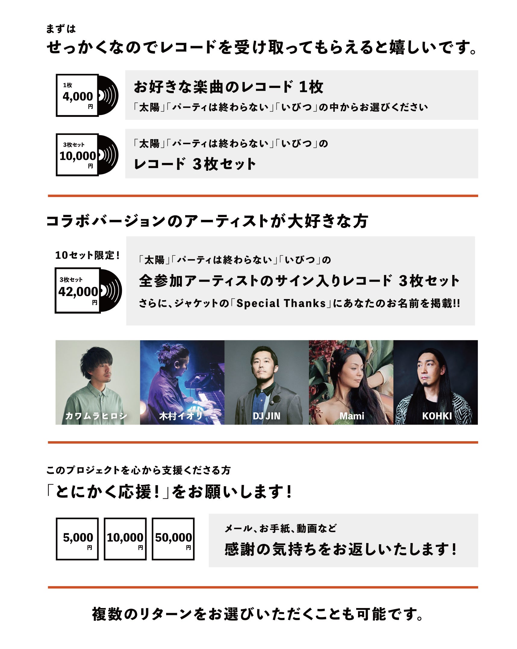 皆様からいただいた支援金は、全額、コラボ楽曲制作費、アナログジャケットデザイン費、アナログプレス代等の制作費用に使用させていただきます。