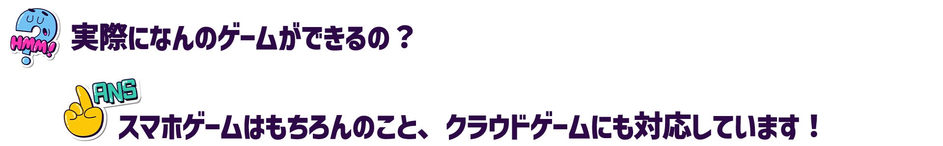 スマホのアプリゲーム(Google Playで配信されているもの)はもちろんのこと、クラウドゲームにも対応しており、Google Play、App Store、Xbox クラウドゲーミング(GamePass)、Steam Link、GeForce NOW等の数千本のクラウドゲームで遊ぶことができます。
