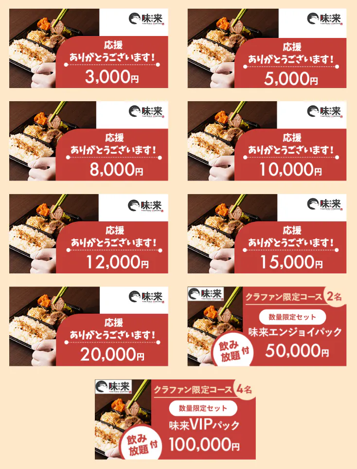来店 食事10%OFFクーポン / 味来盛り極み / 焼肉弁当3個 / ステッカー3枚 / Tシャツ3枚 / エコバッグ / 店内ボードに支援者名記載