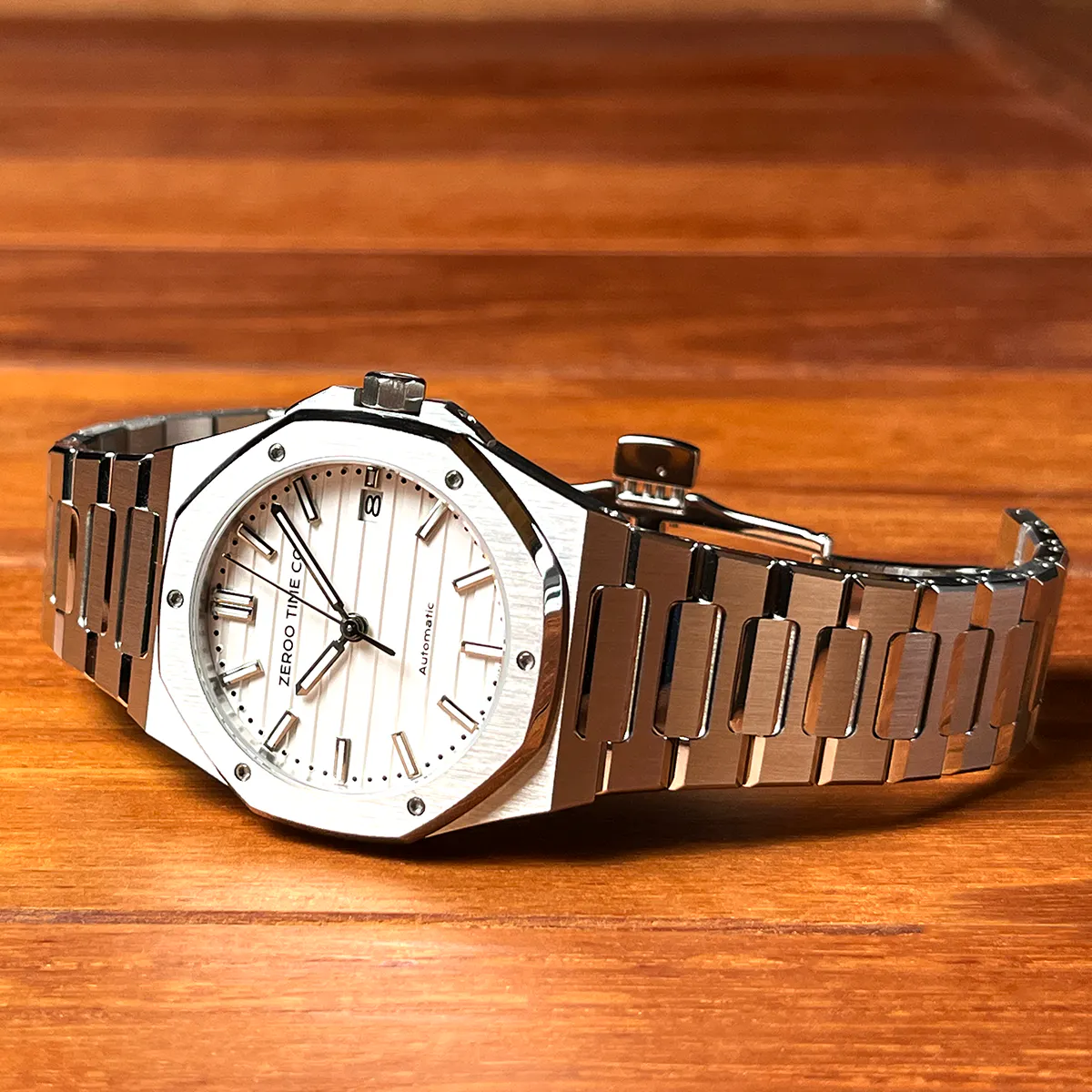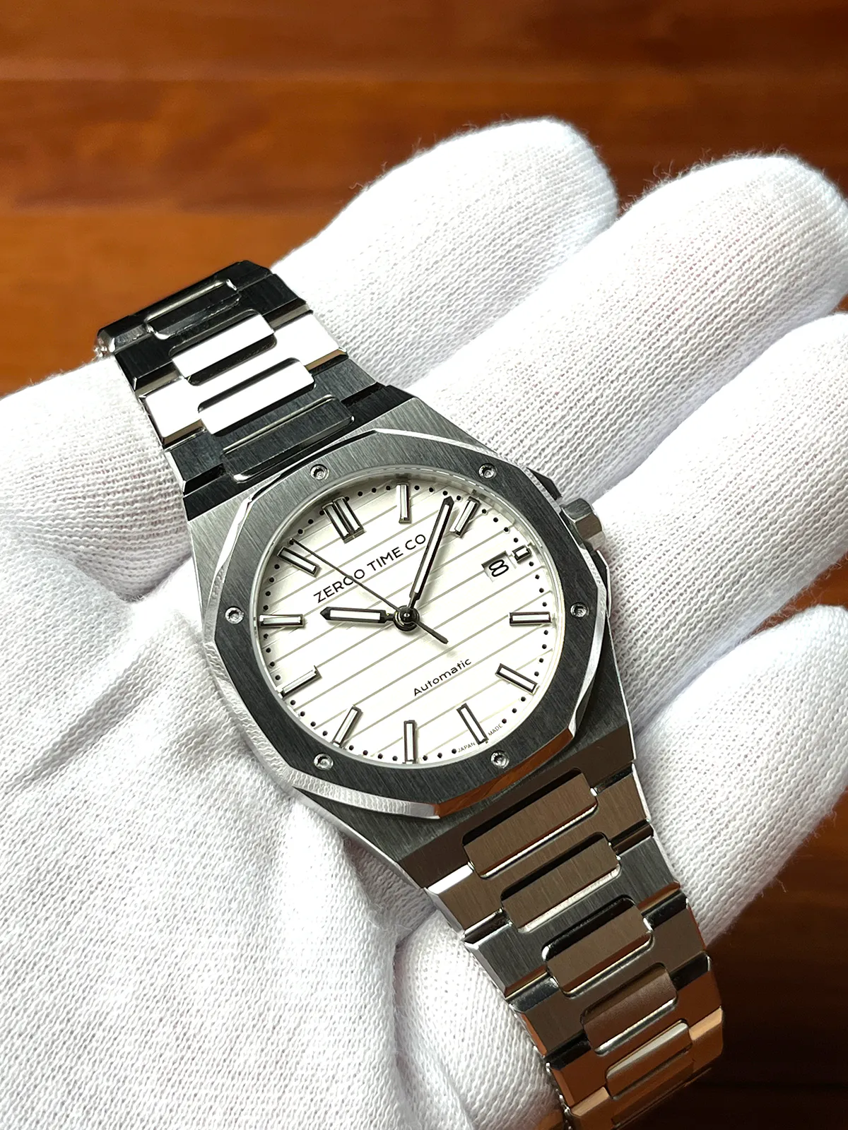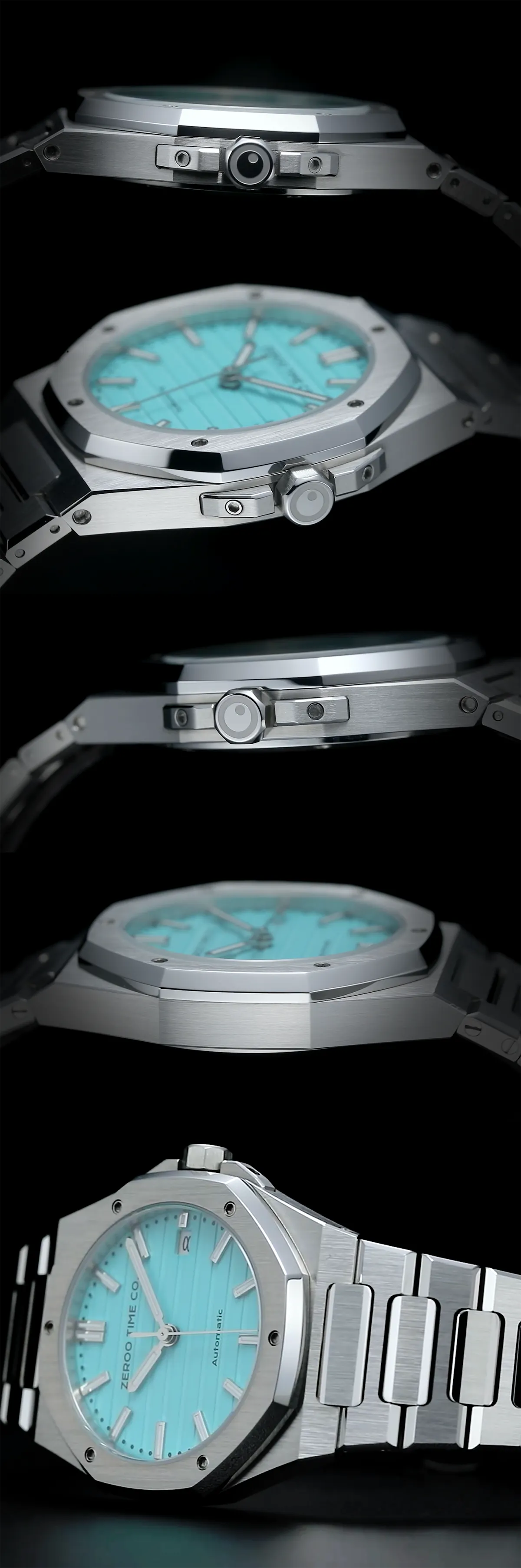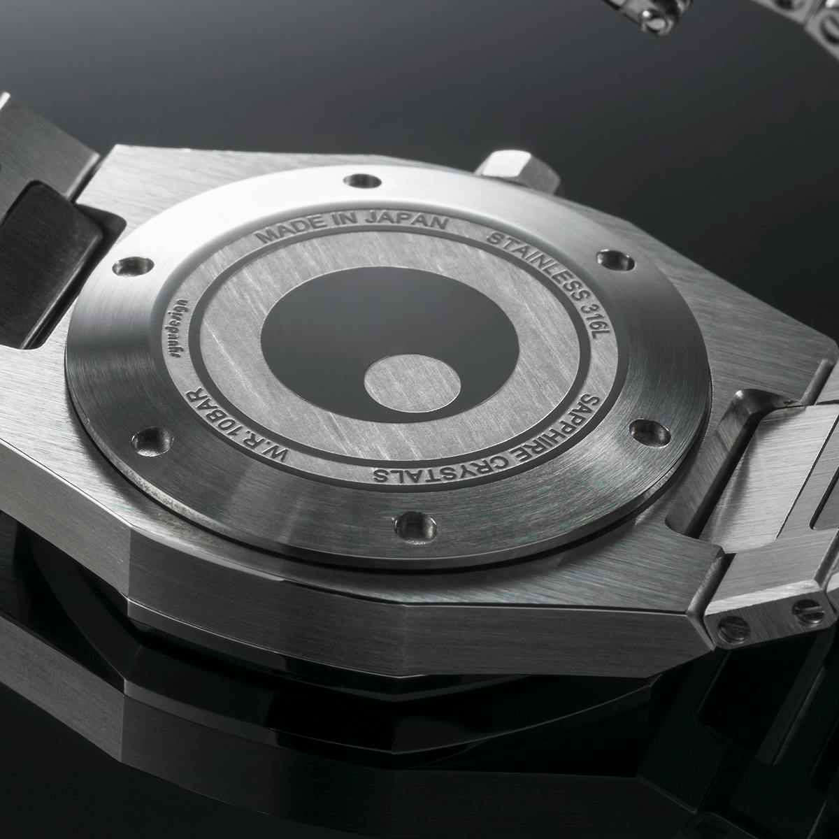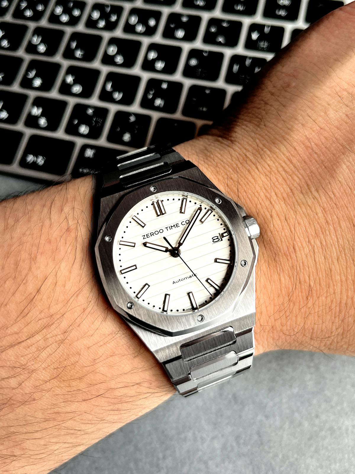 M5エクステリア最大の特徴は薄型のボディです。自動巻ムーブメントは構造上どうしても高さ(厚み)が出てしまうものですがM5はケース厚さ9.4mmを実現しました。ダイアルデザイン、八角形ベゼル、薄型ケース、ZEROO新世代ステンレスブレスレット、針・インデックス形状、すべてをオーセンティック&スリムにまとめ上げました。