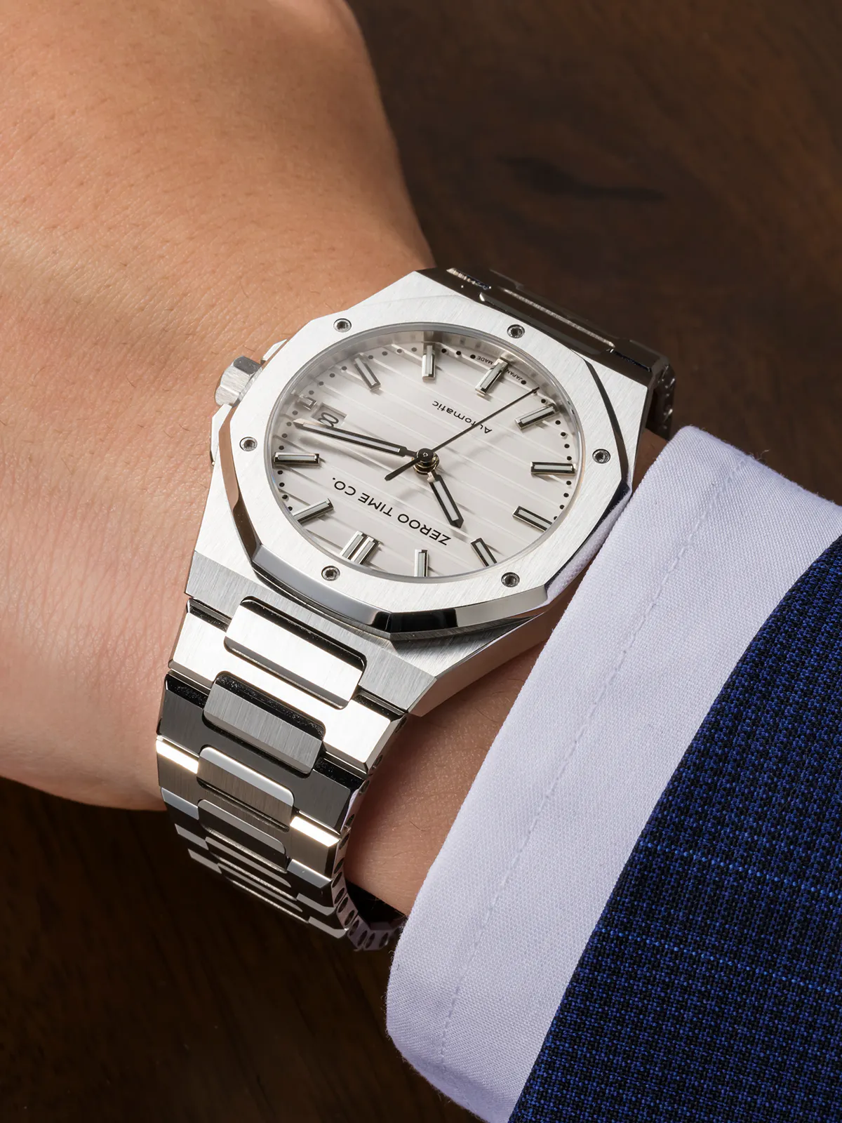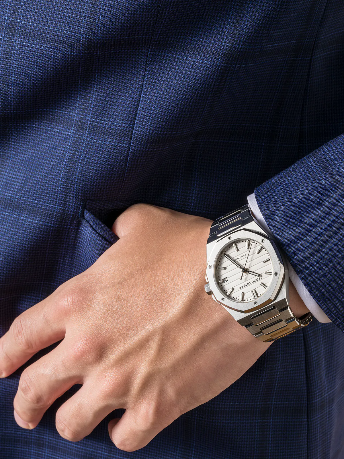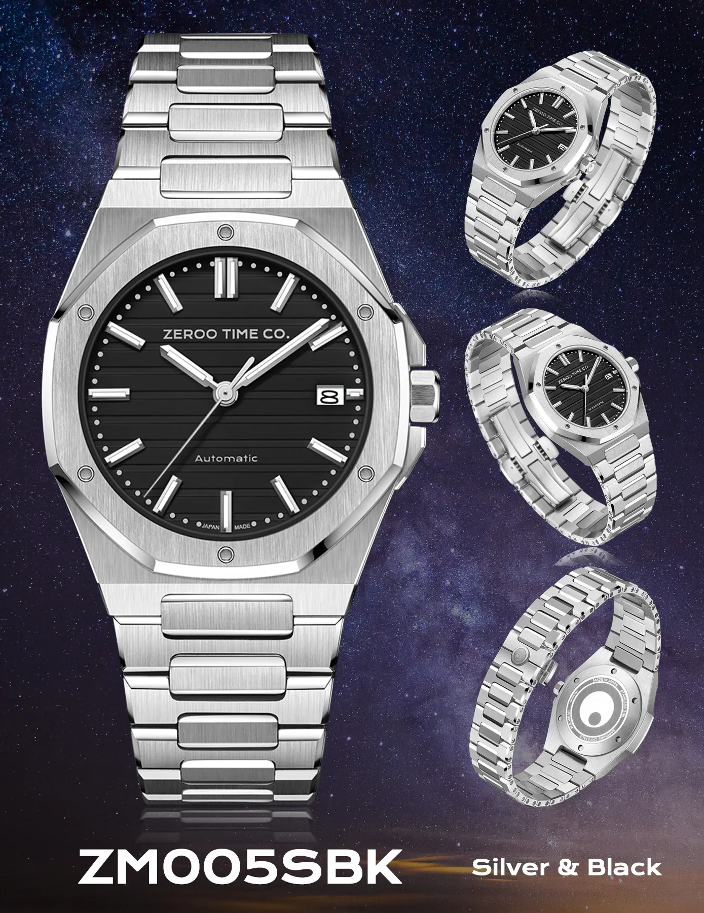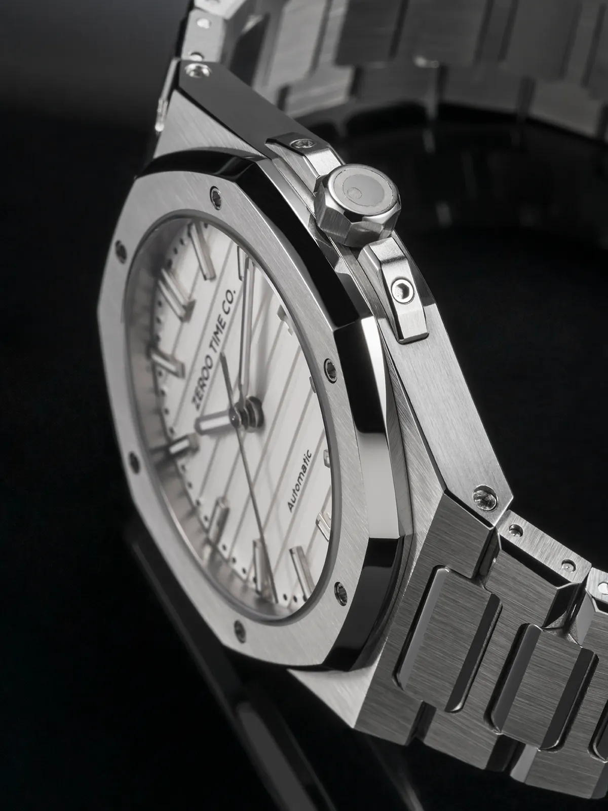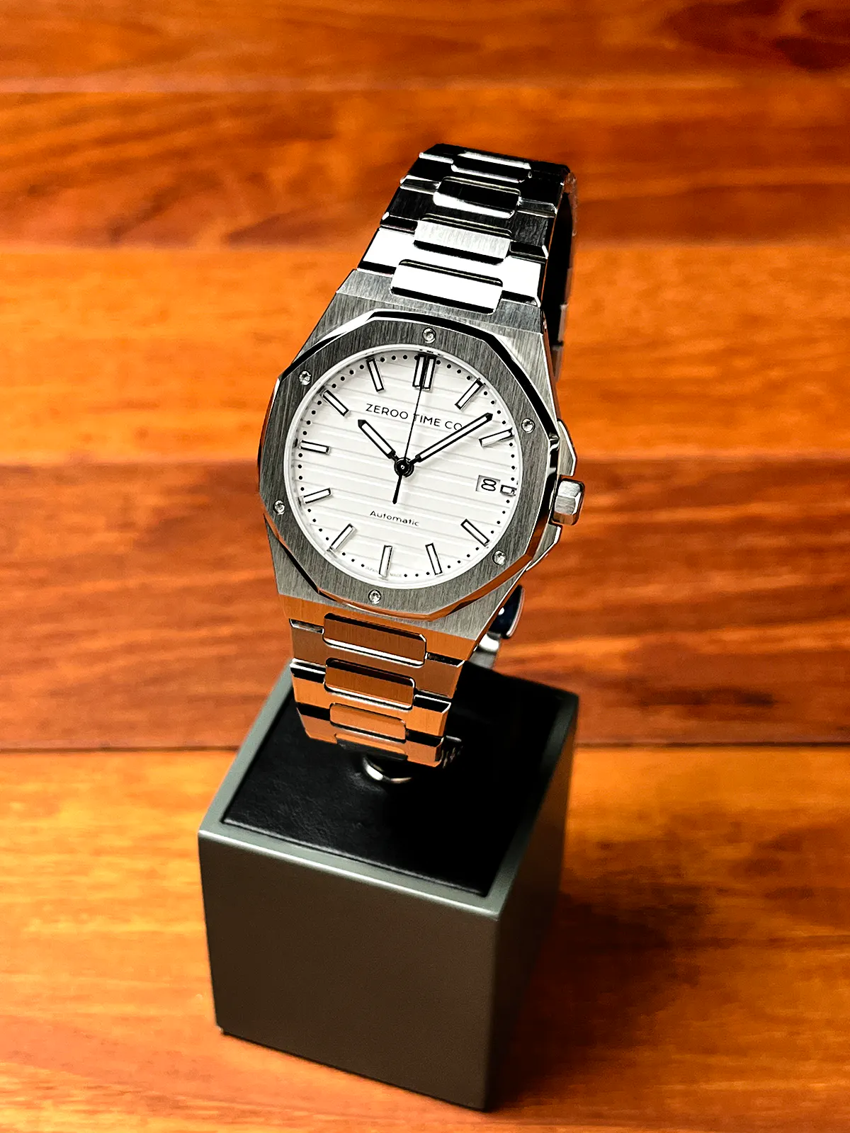 M5エクステリア最大の特徴は薄型のボディです。自動巻ムーブメントは構造上どうしても高さ(厚み)が出てしまうものですがM5はケース厚さ9.4mmを実現しました。ダイアルデザイン、八角形ベゼル、薄型ケース、ZEROO新世代ステンレスブレスレット、針・インデックス形状、すべてをオーセンティック&スリムにまとめ上げました。