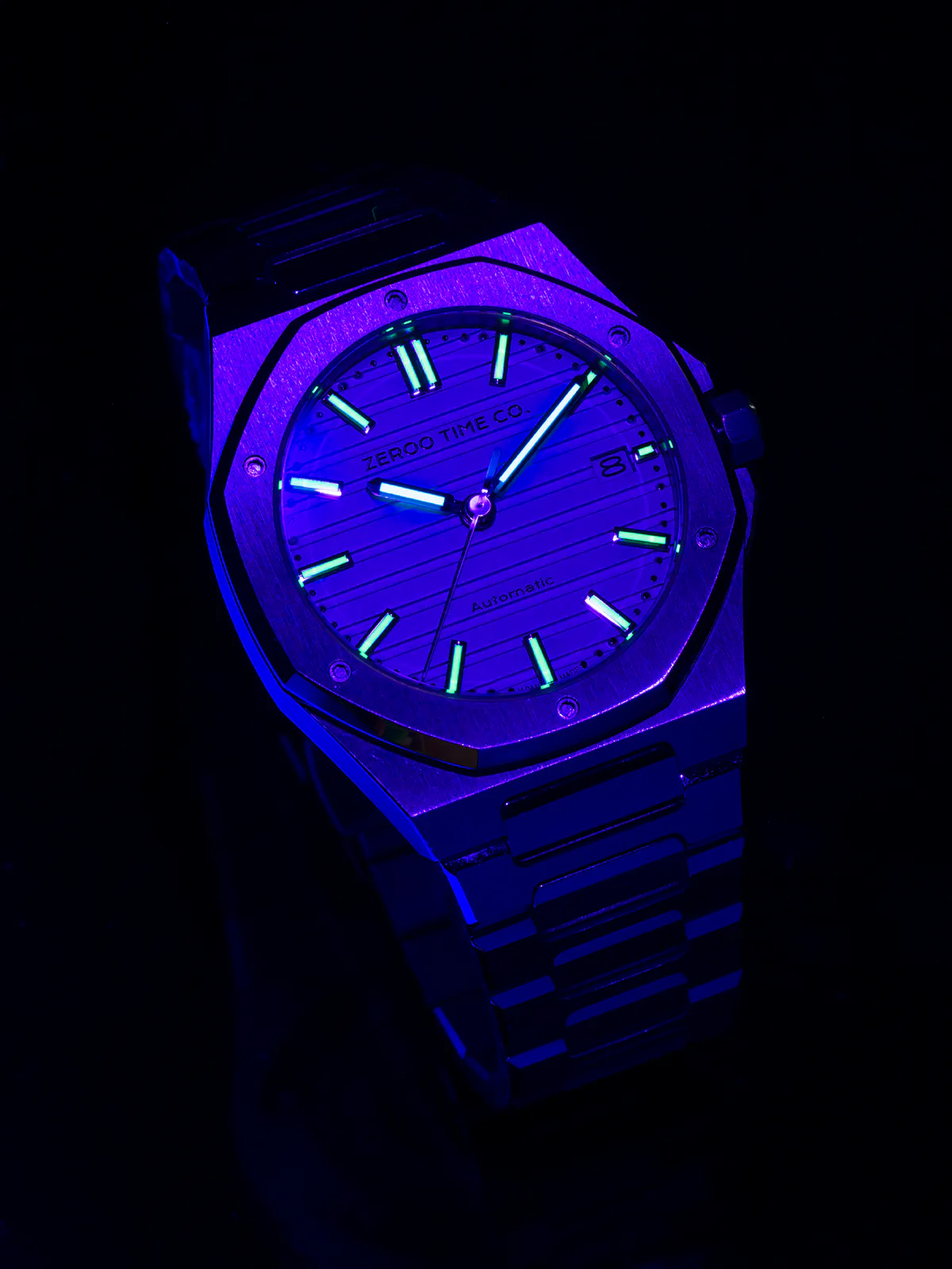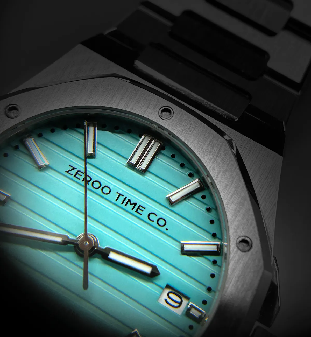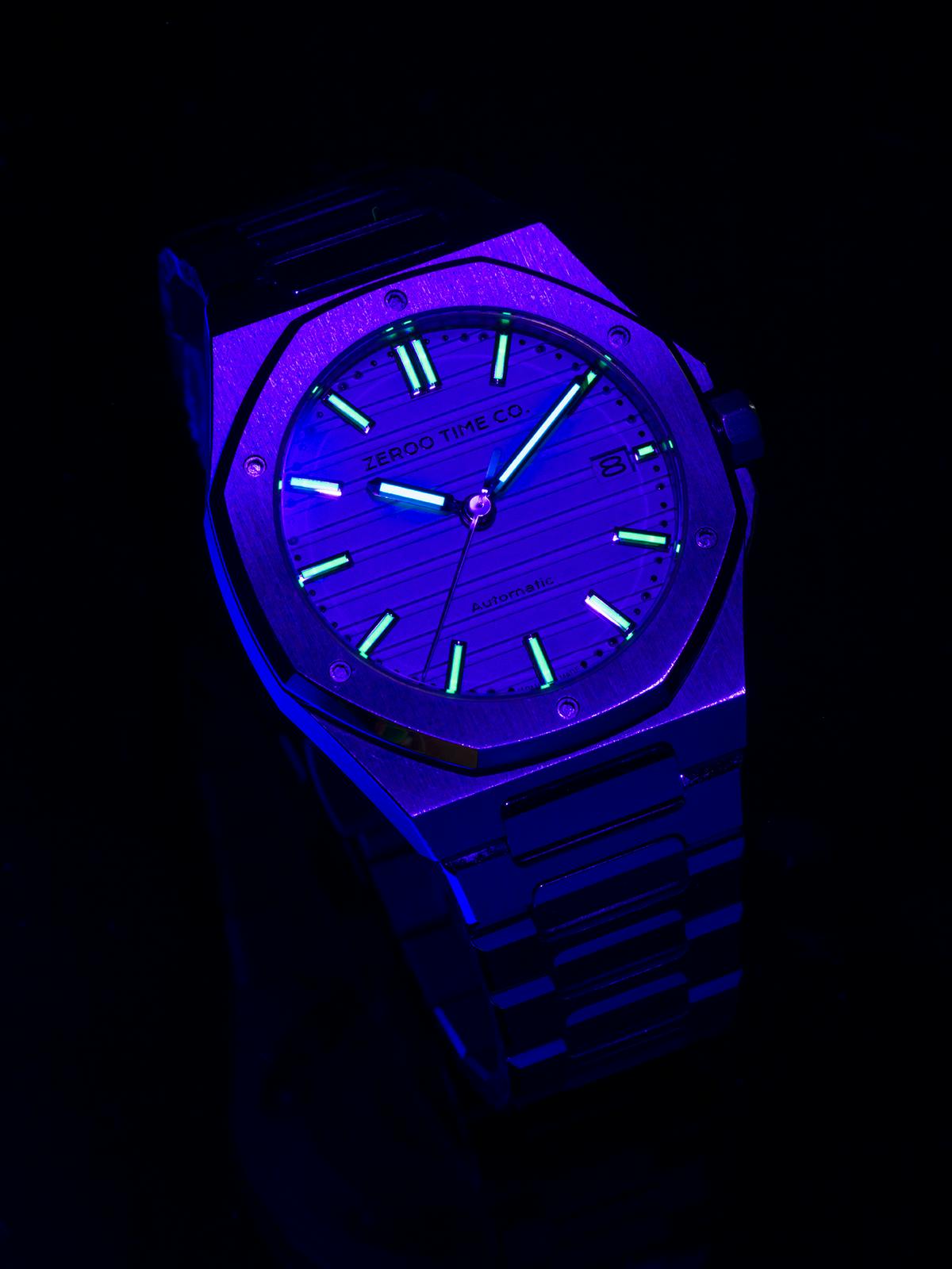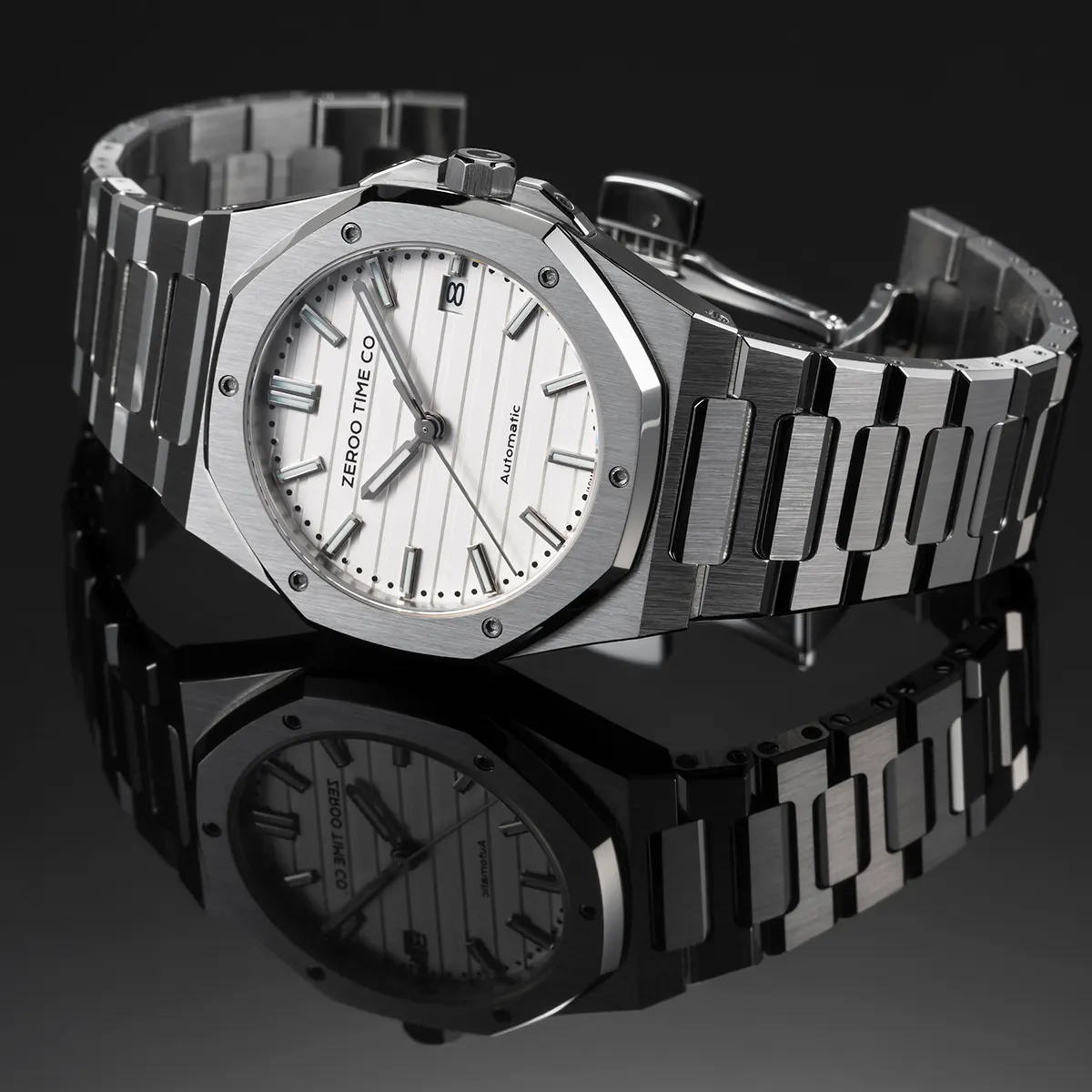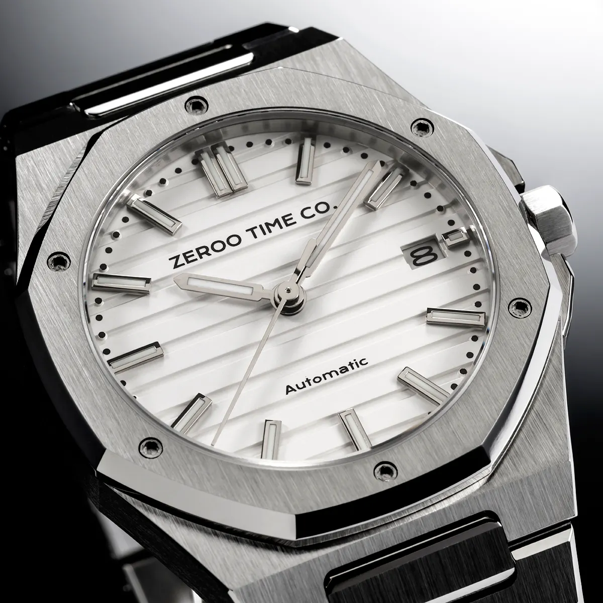M5エクステリア最大の特徴は薄型のボディです。自動巻ムーブメントは構造上どうしても高さ(厚み)が出てしまうものですがM5はケース厚さ9.4mmを実現しました。ダイアルデザイン、八角形ベゼル、薄型ケース、ZEROO新世代ステンレスブレスレット、針・インデックス形状、すべてをオーセンティック&スリムにまとめ上げました。