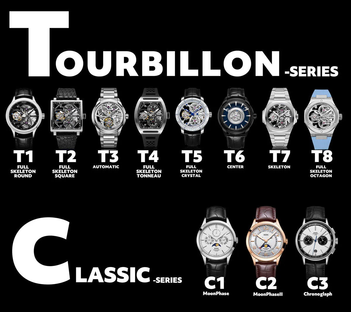 腕時計の世界三大複雑機構の最高峰のひとつであるトゥールビヨンを扱うTシリーズ、ムーンフェイズ等クラシカルな機構のCシリーズ、そして高品質でモダンな機械式腕時計を追求するM(メカニカル)シリーズです。古典とモダンを融合させ新しい価値を生み出すことをモットーとし日々腕時計開発に取り組んできました。