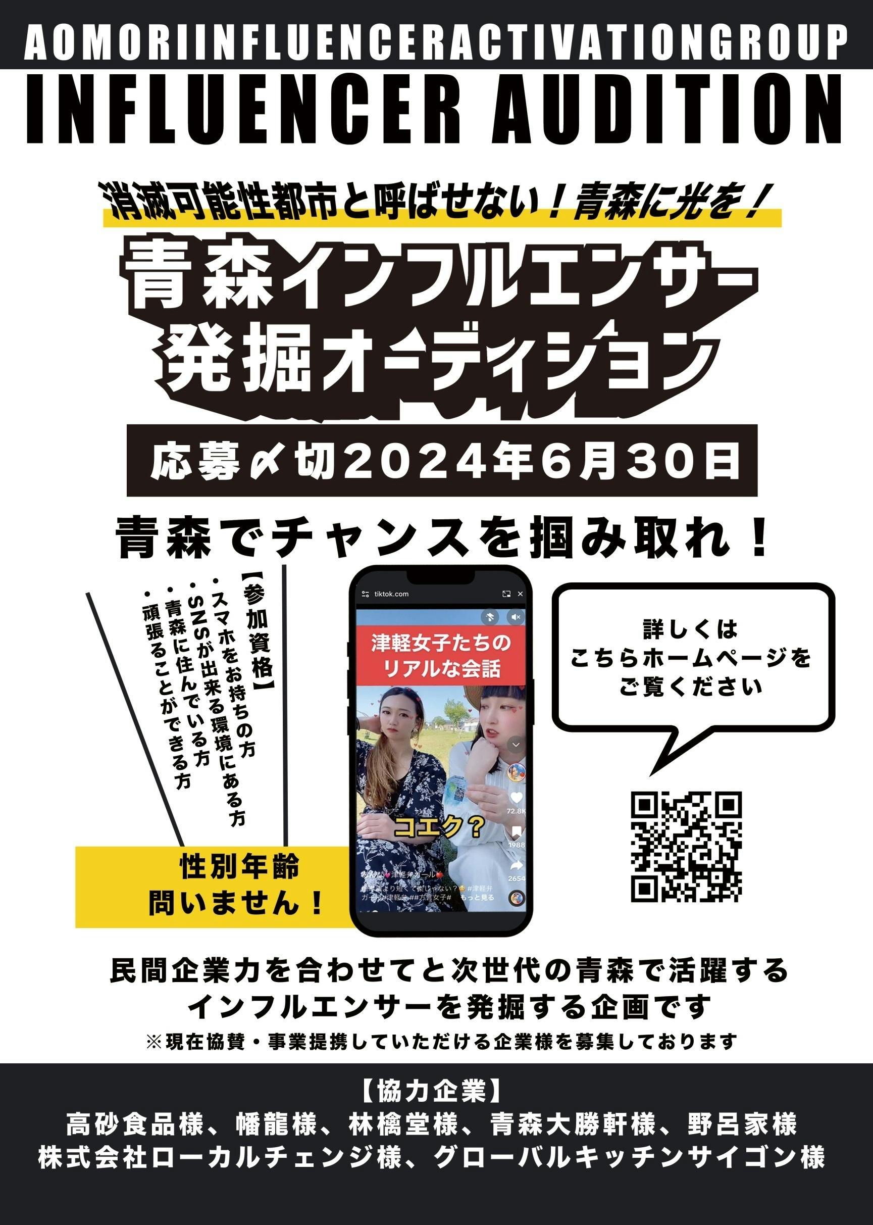 2024/06/07 11:38【青森インフルエンサー発掘オーディション企画】青森を発信するスターを作ろう!!青森で活躍する次世代のインフルエンサーを民間企業が力を合わせて発掘し育てる企画です!https://aomori-influ.com/oudition【開催日時】令和6年7月14日(日)【会場】高砂食品㈱ 本社青森県平川市日沼富田36【参加資格】性別年齢問いません!・スマホをお持ちの方・SNSが出来る環境にある方・青森に住んでいる方・頑張ることができる方【こんな未来を手に入れよう】◆あなただけのオリジナル楽曲を提供してもらえます※今後のSNS活動でオリジナル曲を使用して活動が可能です◆プロにプロフィール写真等宣材写真を撮影してもらえます◆企業案件をもらうことが出来ます◆青森県インフルエンサー活性会のアンバサダーとしてメディア出演が出来ます◆イベントに出演出来ます【協力企業様】高砂食品㈱様㈱林檎堂様幡龍様青森大勝軒様野呂家様㈱ローカルチェンジ様グローバルキッチンサイゴン様【オーディションの流れ】①応募フォームからお申し込み②写真を送るためのLINE URL送付③送られてきたLINEに顔写真/全身写真送信④7月7日一次審査結果発表をメールで通知⑤指定のお題でショート動画作成⑥7月14日弘前市で面談二次審査⑦二次審査結果通知⑧3ヶ月間研修⑨面談を行い活動を続けられるか判断その後インフルエンサー活動本格始動○オリジナル楽曲提供○企業動画に出演○インフルエンサー活性会アンバサダー登録○案件依頼○コラボ出演オファー設定などインフルエンサーになるための活動を協賛企業様と青森県インフルエンサー活性会が支援させていただきます。主催 青森県インフルエンサー活性会https://aomorikenn-influencer-kasseikai.my.canva.site/ もっと見る