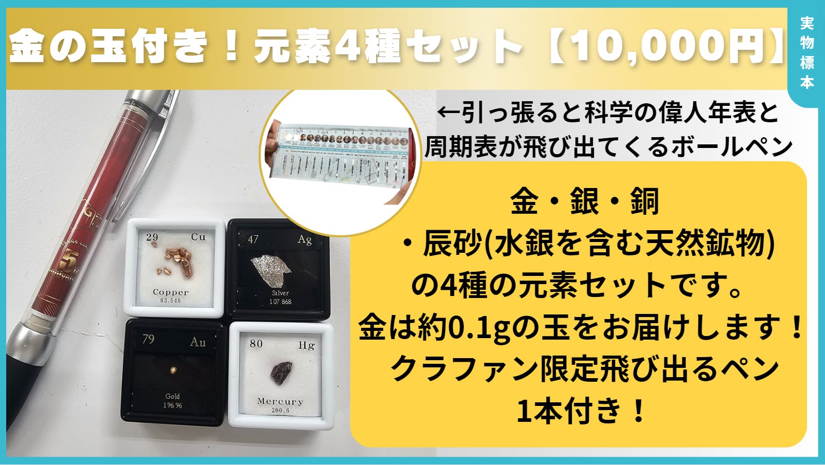 【豪華元素4種セット】金・銀・銅・辰砂の4点+飛び出るペン付き!金の玉約0.1g