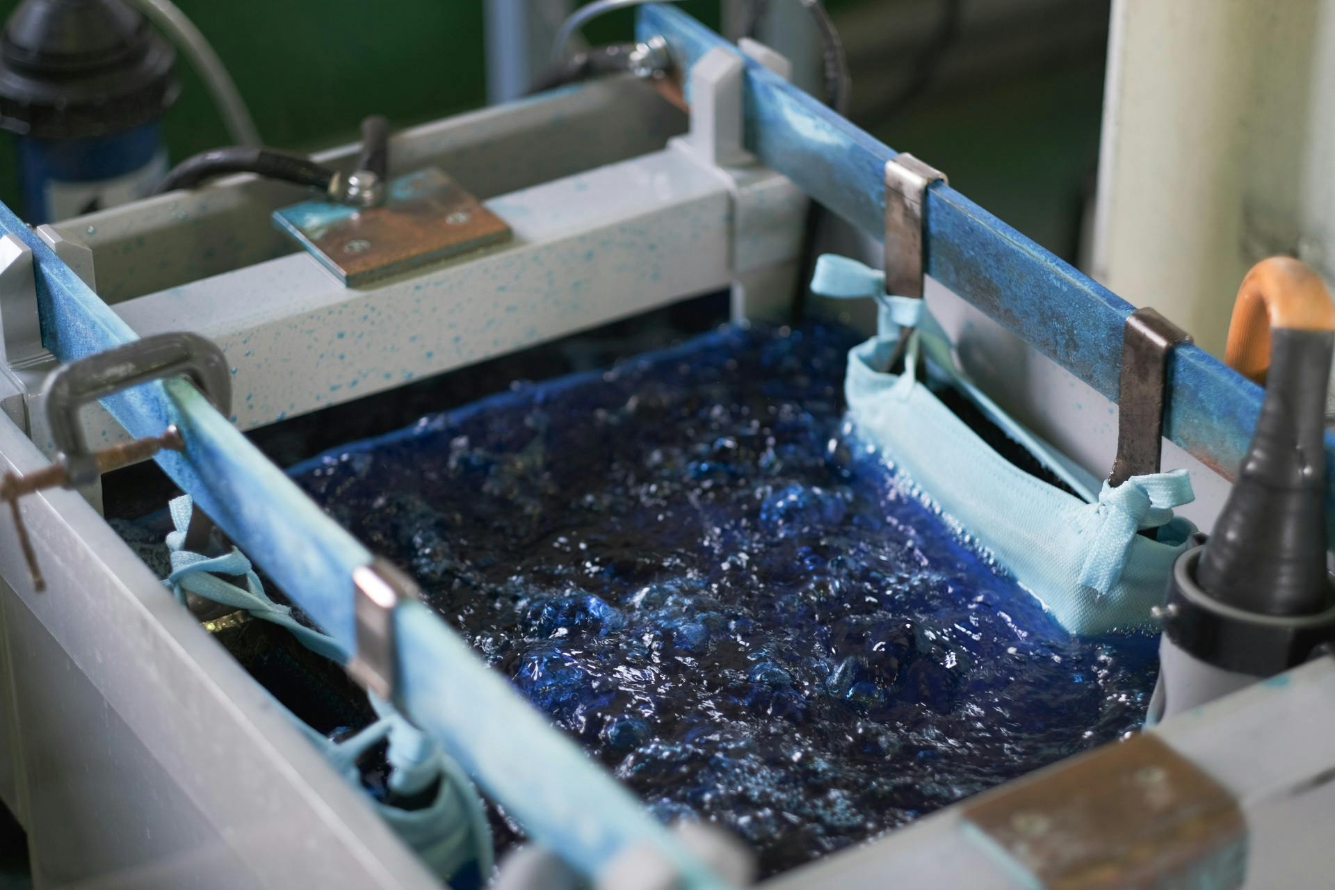 私たちが用いている技術は、専門用語では「湿式めっき法」と呼ばれています。めっきを施したい素材を、複数の化学溶液に浸漬させる工程を経て、その間に化学的・電気的反応を引き起こすことで、素材の表面に本物の金属の薄膜が成膜されます。化学に裏付けられた技術ではありますが、実際にその工程を体感して実際にめっきが施される様子を見るとなんとも神秘的な気持ちになります。