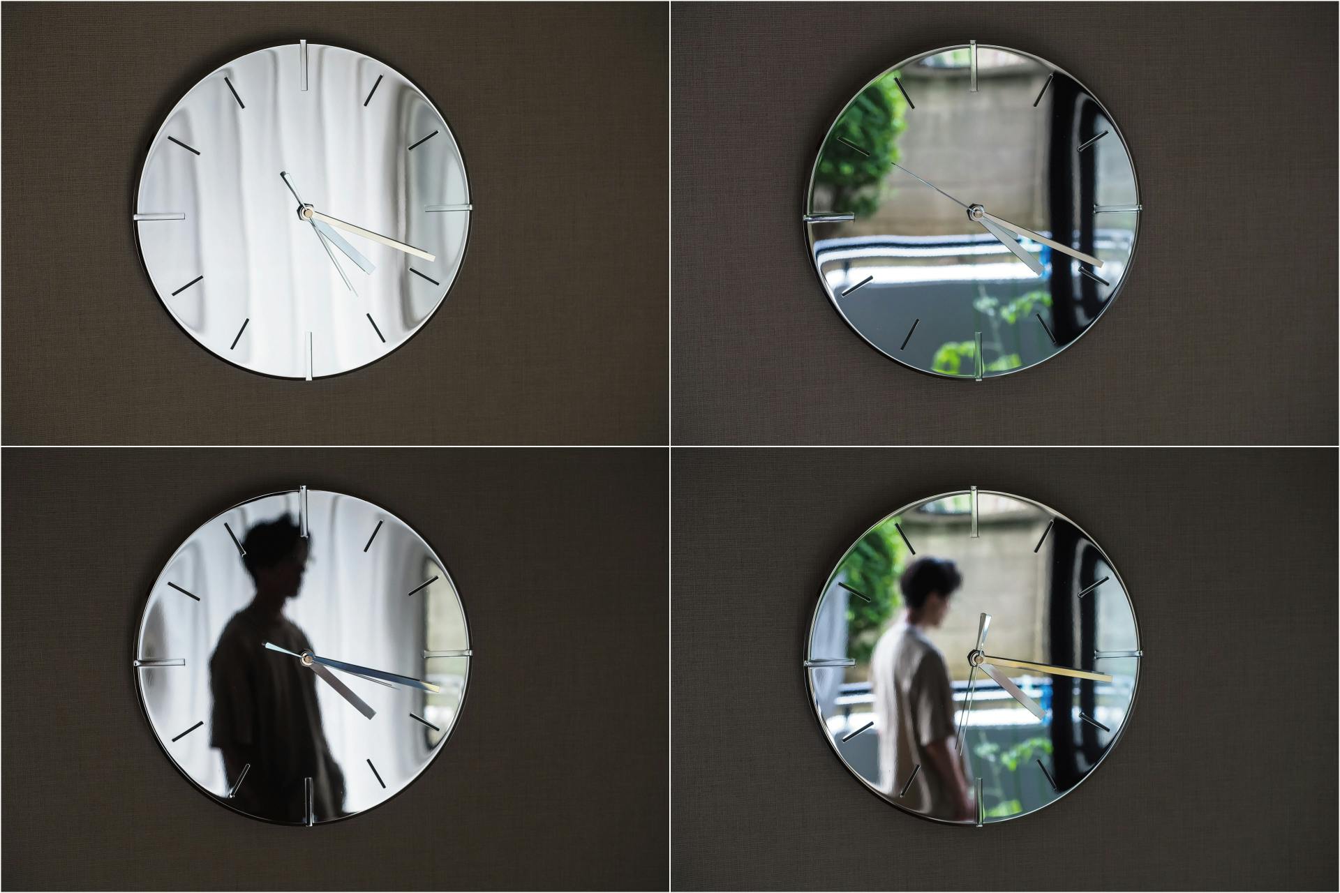 鏡面反射仕上げの時計はひかりを反射して輝き、拡散するので朝、昼、夜と差し込むひかりによって雰囲気を一変し針を読むというよりも感覚的に時間の変化を楽しむことが可能です。
