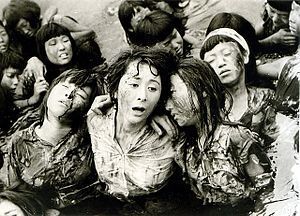 原爆投下を直接経験した者がいる広島市の市民約8万8500人が手弁当のエキストラとして参加し撮影された、逃げまどう被爆者の群集シーンが心に迫る。