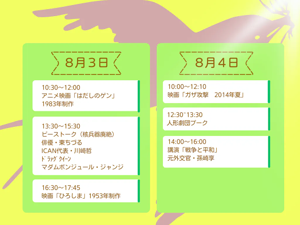 出演者の方のお話、人形劇や映画、展示されている原爆や核兵器廃絶運動の資料、絵本の原画、反戦平和の取り組みのパネルなどみて、きいて、感じて、ともに考えていただけるよう企画の準備をすすめています。