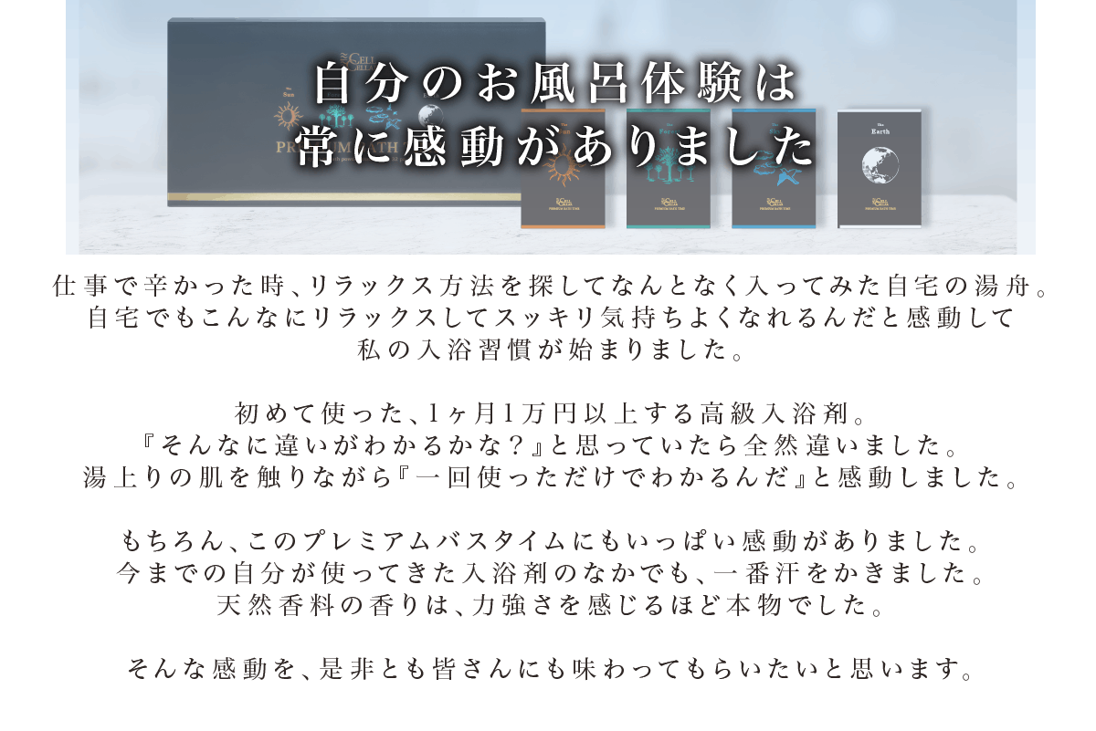 ぜひ、この入浴剤で最高の感動体験をしてほしいと思います。