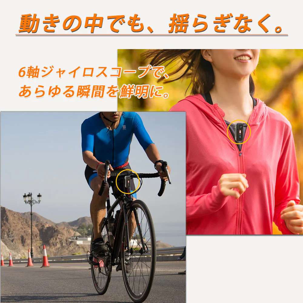 通常、激しい動きを伴うアクティビティでは、カメラの手ブレが避けられず、結果として映像はぼやけてしまいます。しかし、このカメラの革新的な6軸ジャイロスコープ防振機能は、あらゆる角度からの動きや振動を感知し、リアルタイムで補正。これにより、どんなに激しいアクションシーンでも、驚くほど安定した映像を実現します。