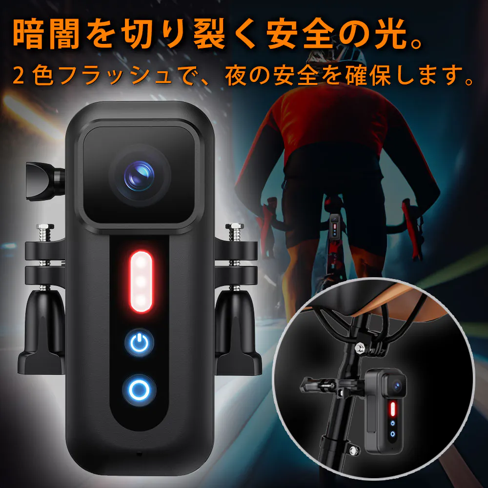 自転車の夜間走行は、都市の喧騒を抜け出す最高の方法の一つです。しかし、安全は常に最優先事項です。この4Kマルチ機能カメラには、安全性を飛躍的に向上させる2色のフラッシュテールライトが内蔵されています。暗闇の中でもあなたの存在を確実に周囲に知らせ、後ろを走る車や自転車に対して、明確に「ここにいます」とアピールできます。