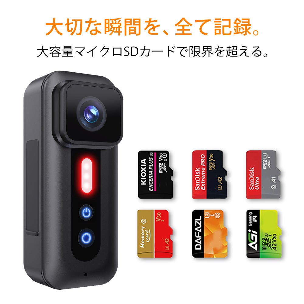 このカメラは、最大256GBの大容量マイクロSDカードに対応しており、長時間の高解像度ビデオや数千枚の写真を、心配なく保存できます。一日中のアドベンチャー、一週間にわたる旅行、または特別な人生のイベント。これらを一つ一つ、細部まで鮮明に捉えたい、という願いを叶えます。