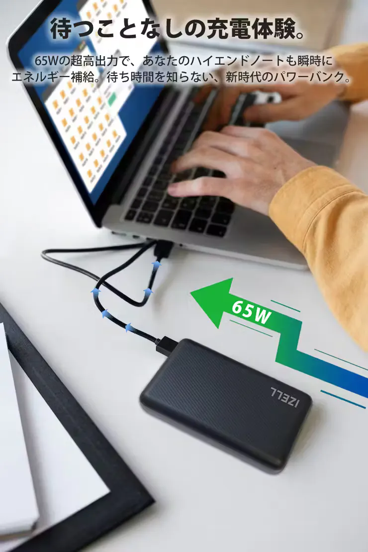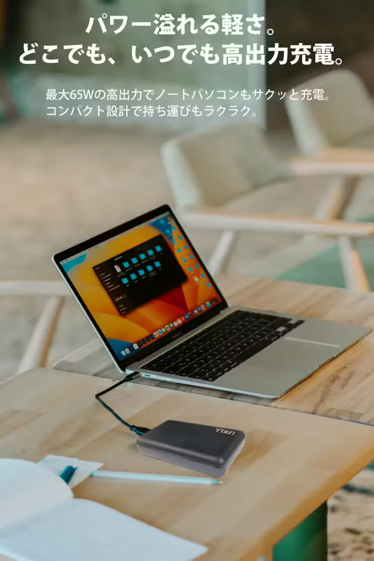 65Wの超高出力を持つこのバッテリーは、これまでのモバイルバッテリーでは想像もつかなかった高出力を実現。