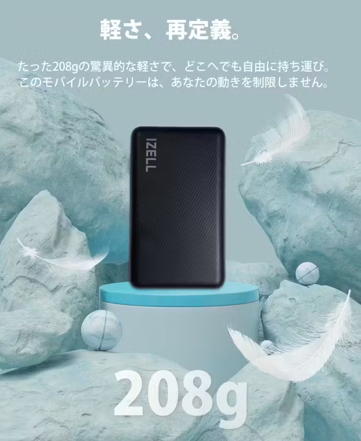 ポケットやカバンにすっと入るこのモバイルバッテリーは、他の多くのバッテリーよりも圧倒的に軽いのが特徴です。多くのモバイルバッテリーはその重さから、常に携帯するのが難しい場合がありました。しかしこのモバイルバッテリー「IZELL-505」は従来のものより遥かにに軽い208g。バッテリーの重さを気にすることなく、気軽にカバンに入れて持ち歩くことができます。