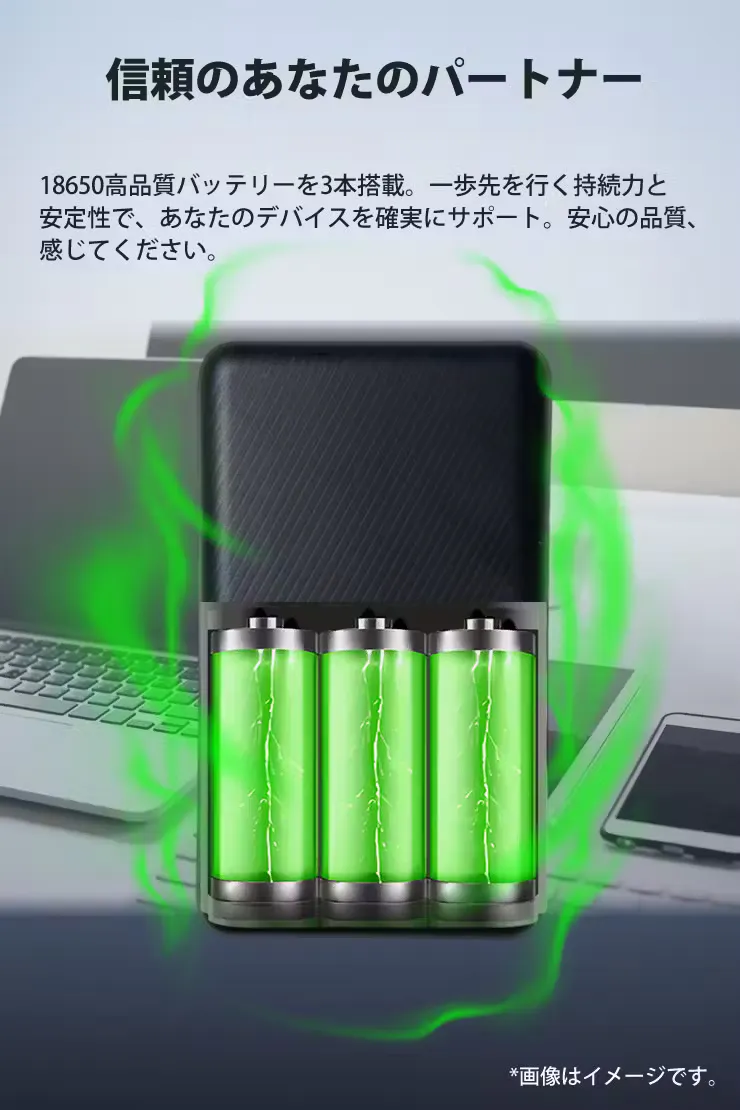 このバッテリーには、高品質とされる「18650バッテリー」を3本も使用しています。これは、単に長い時間使用できるというだけでなく、その充電が非常に安定していることを意味します。安定した充電とは、デバイスへの安全な電流供給や、充電の劣化を遅らせること。一度充電すれば、あなたの大切なデバイスをしっかりとサポートし、思いもよらぬトラブルから守ります。