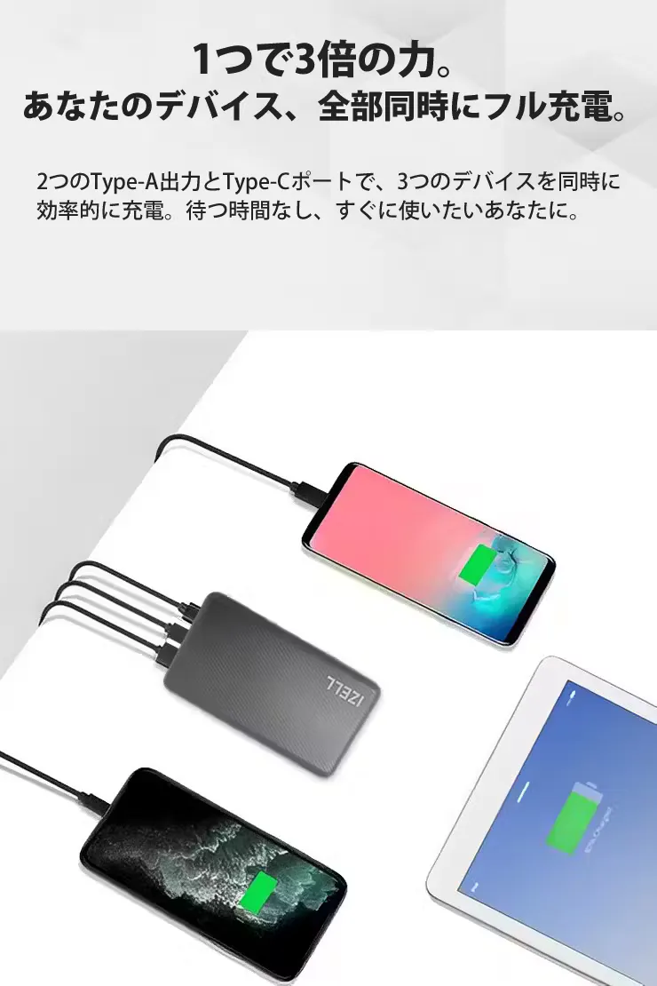 このモバイルバッテリーはType-A出力ポートが2つ、さらにType-Cポートも装備しているため、3つのデバイスを同時に充電することができます。外出先でスマートフォン、イヤホン、そしてタブレットのバッテリーが一気に低くなってしまったときでもコレ一つで充電可能です。