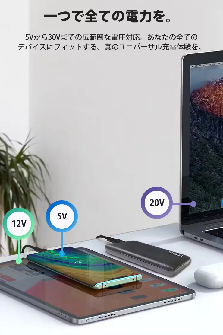 このモバイルバッテリーは、5Vから30Vまでの電圧にフレキシブルに対応し、各種デバイスをしっかりとサポートします。