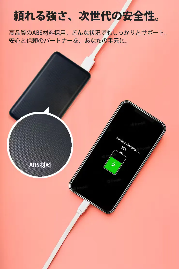 このモバイルバッテリーはABS材料という素材を採用しているため、耐久性が高く、あらゆる日常の衝撃からもしっかり守ってくれます。さらに、ABSは熱や電気に対しても高い安全性を持っているので、充電中の安全もしっかり確保します。