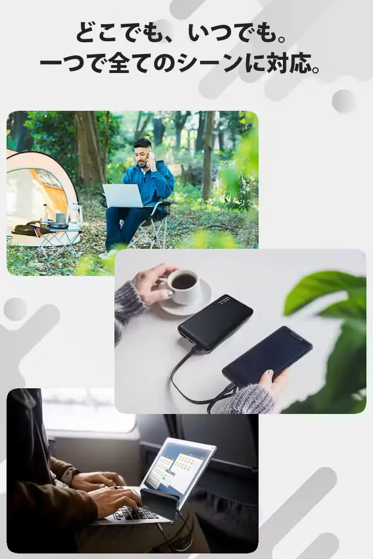 このモバイルバッテリーが持つ10050mAhの大容量は、スマホを何度もフル充電可能なだけでなく、タブレットやその他のデバイスもサポート。一日中外出しても、夜遅くまで忙しい日でも、このバッテリーがあればエネルギー切れの心配はありません。