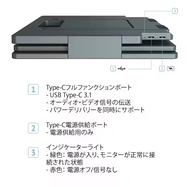 Type-C電源ポート×1フル機能Type-Cポート×1電源ボタン×1左側:MENU/+/-ボタン右側:MENU/+/-ボタン