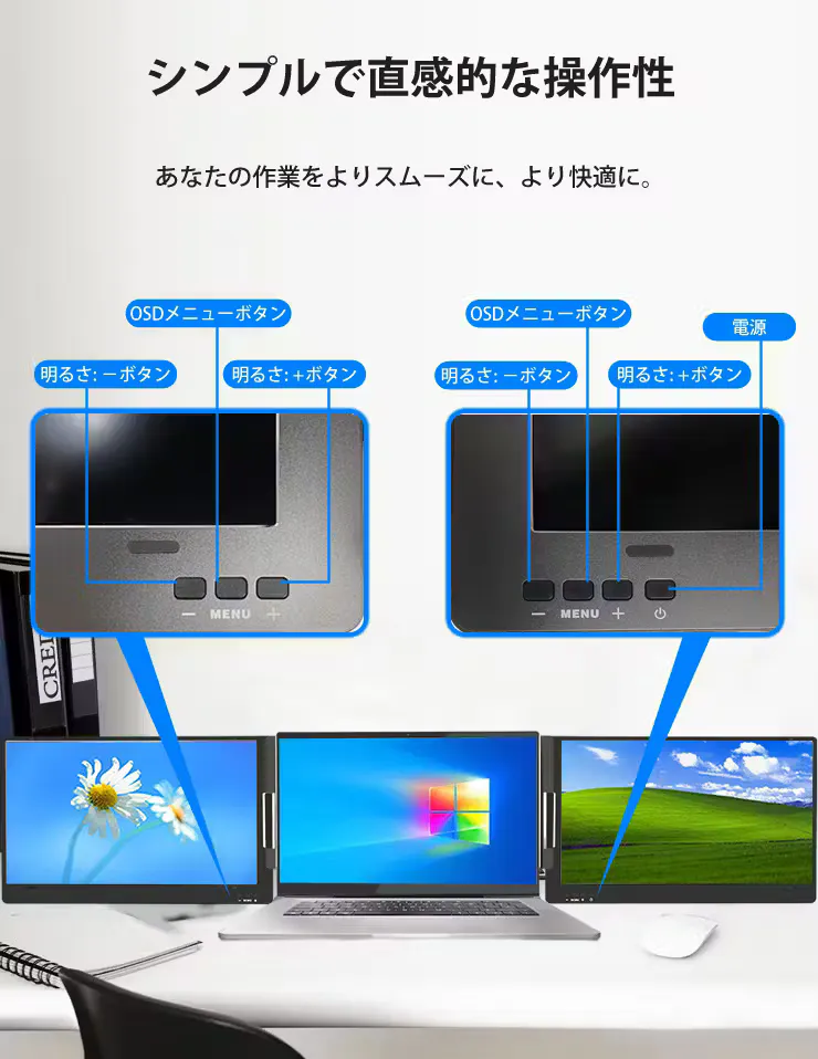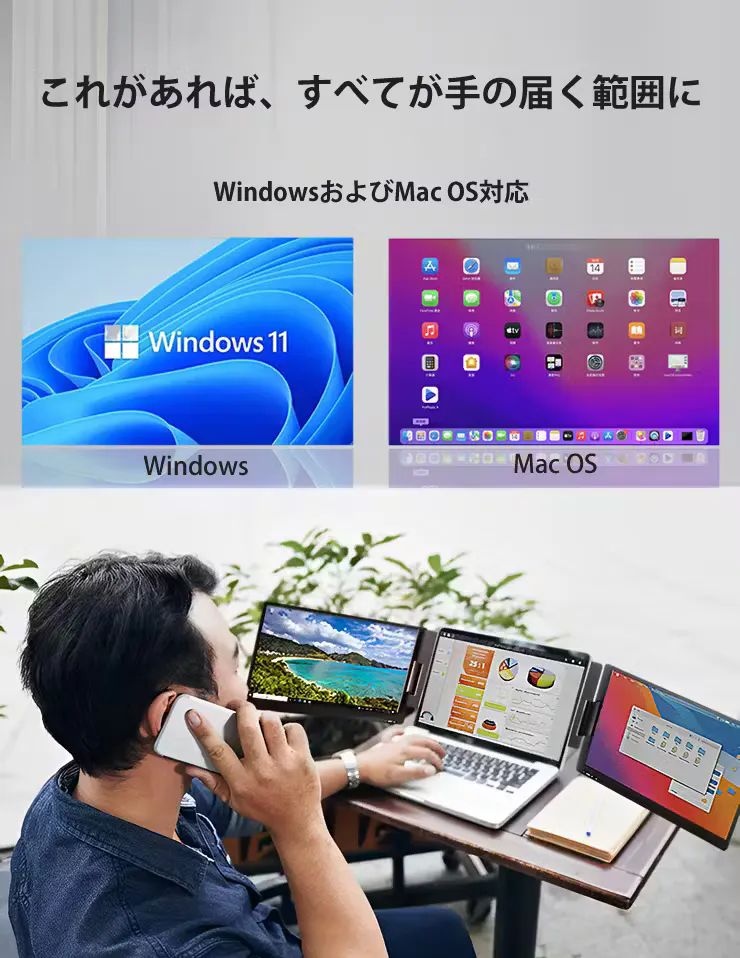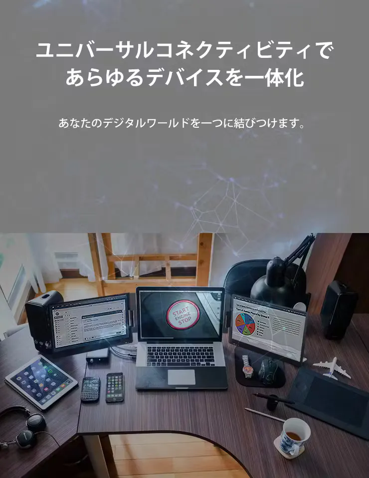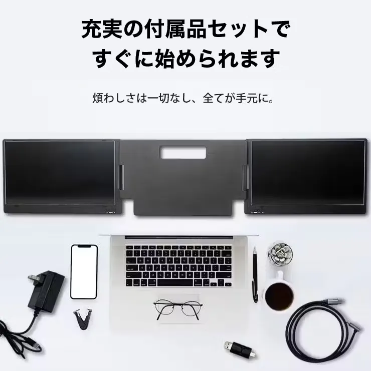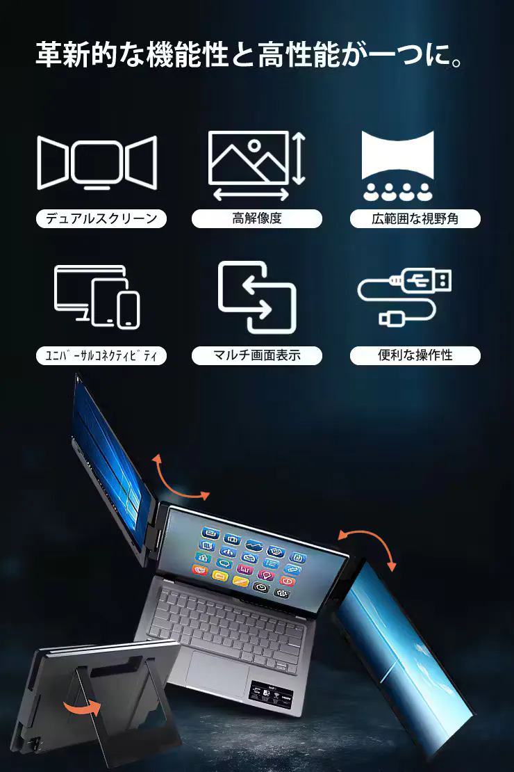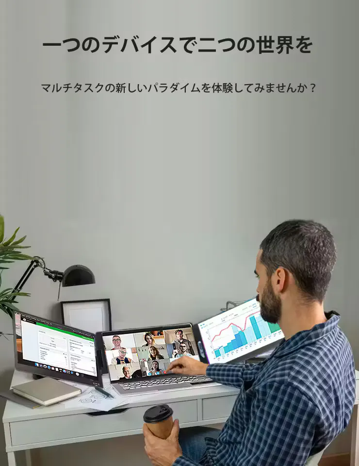 今まで1画面だったモニターを、3画面まで拡張可能。折りたたんでコンパクトに持ち歩けるため、あなたがどこにいてもデスクトップの便利さを提供。タスクをより効率的に管理することができます。
