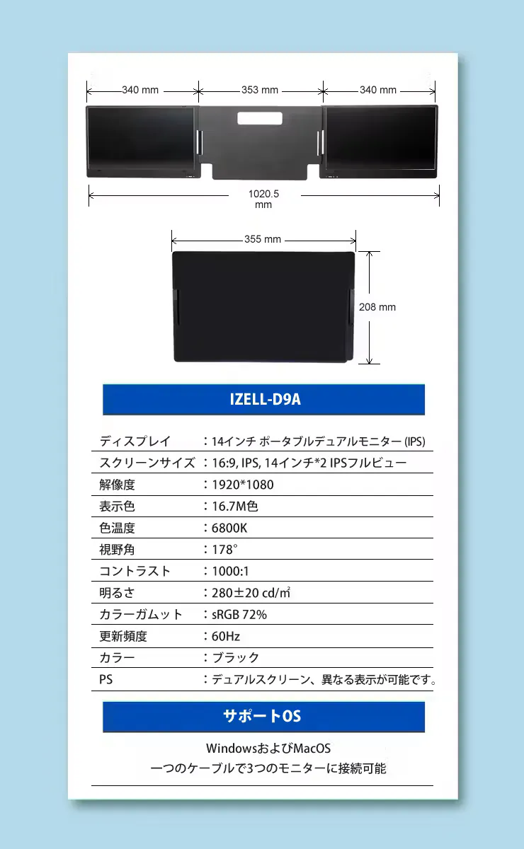 この、14インチ ポータブルデュアルモニターIZELL-D9Aは、そんな不満を解消すべく開発されました。