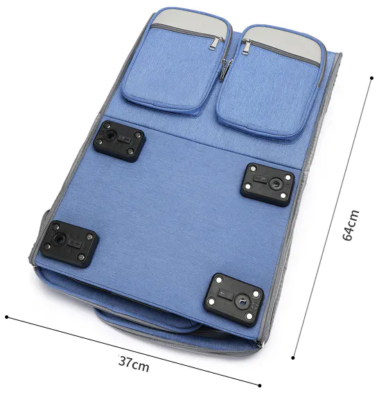 バッグ中央のファスナーで上下を連結し、各パッドを適切な場所に配置するだけで完成。簡単に準備が整います。