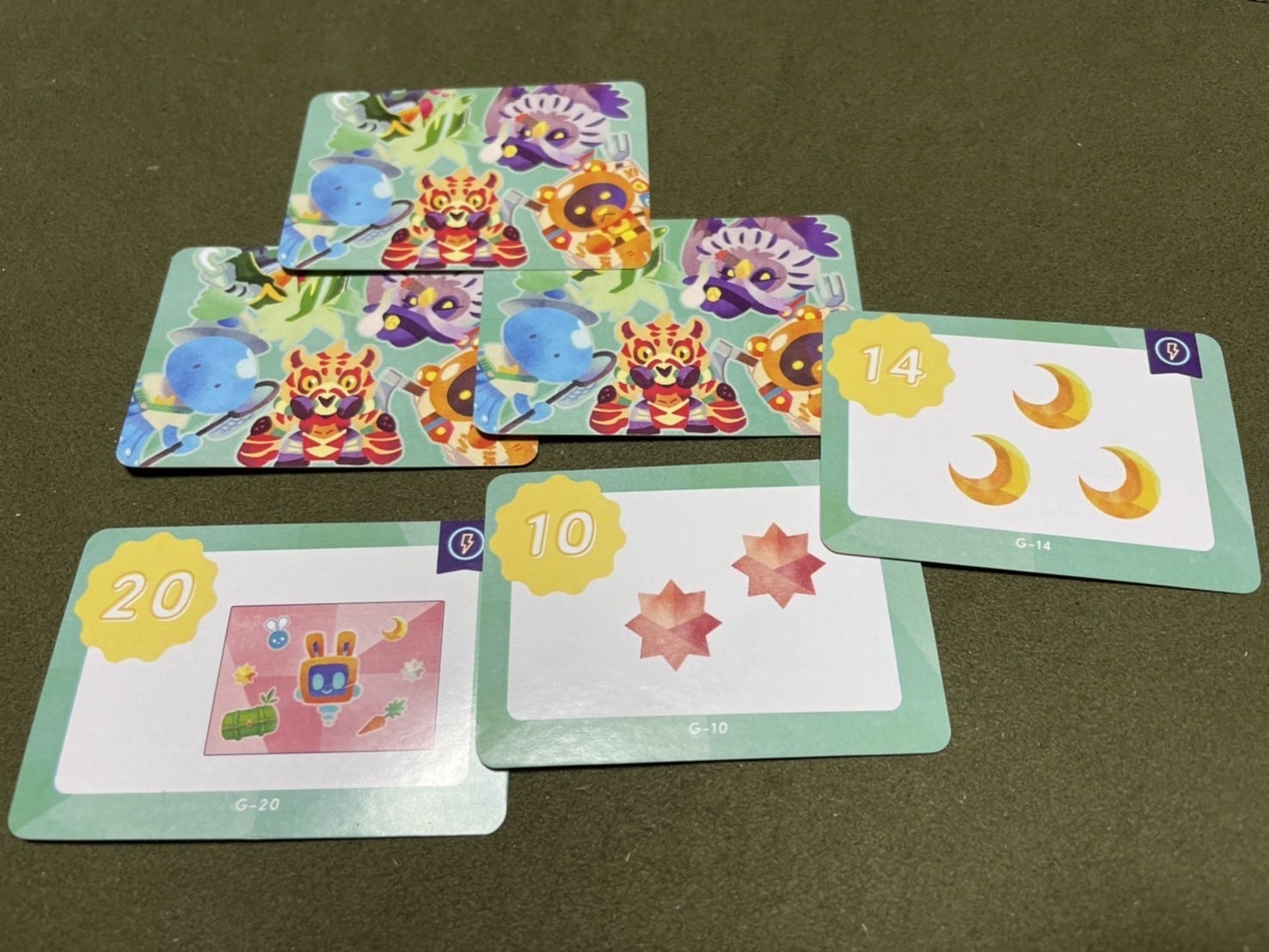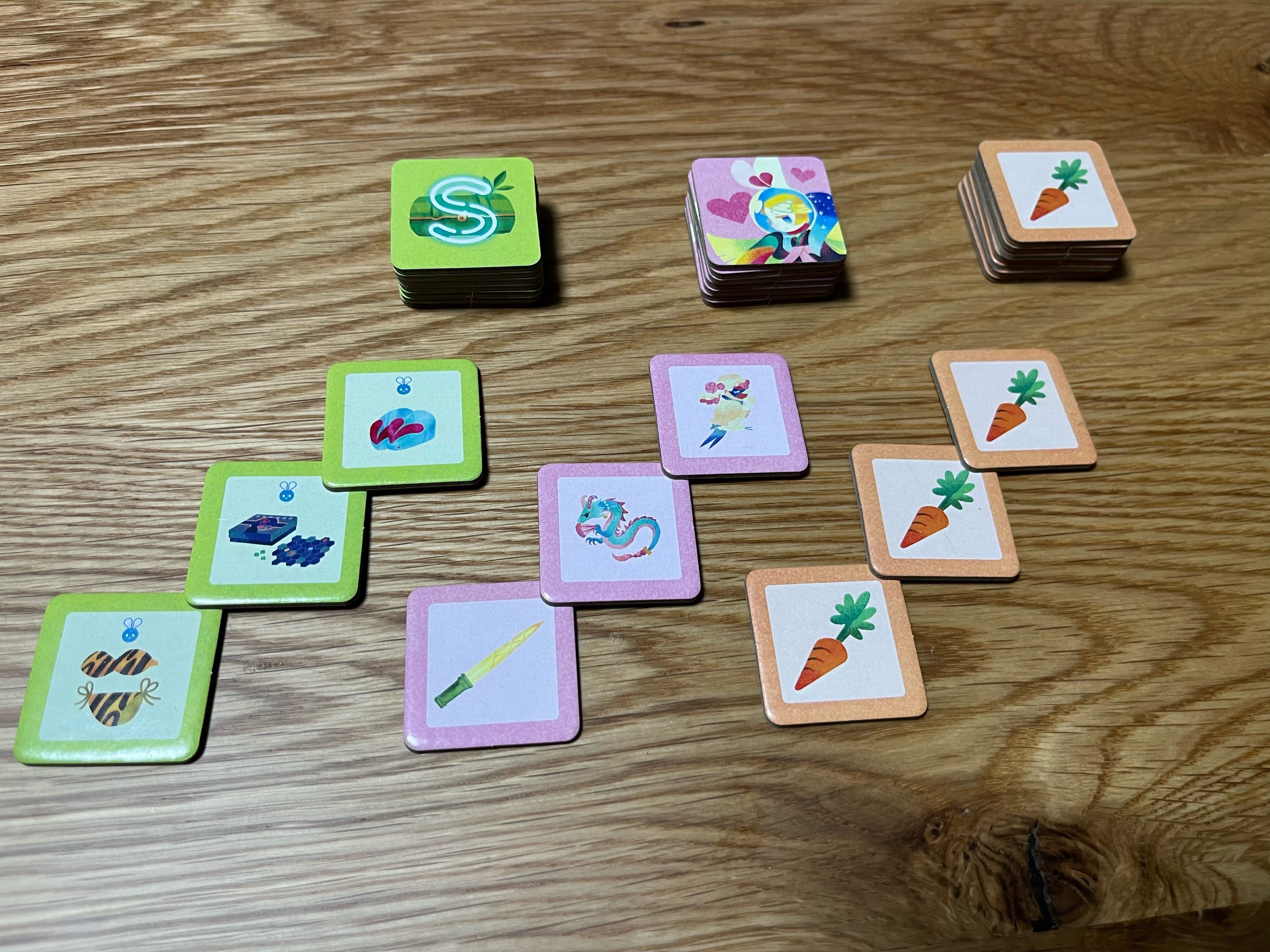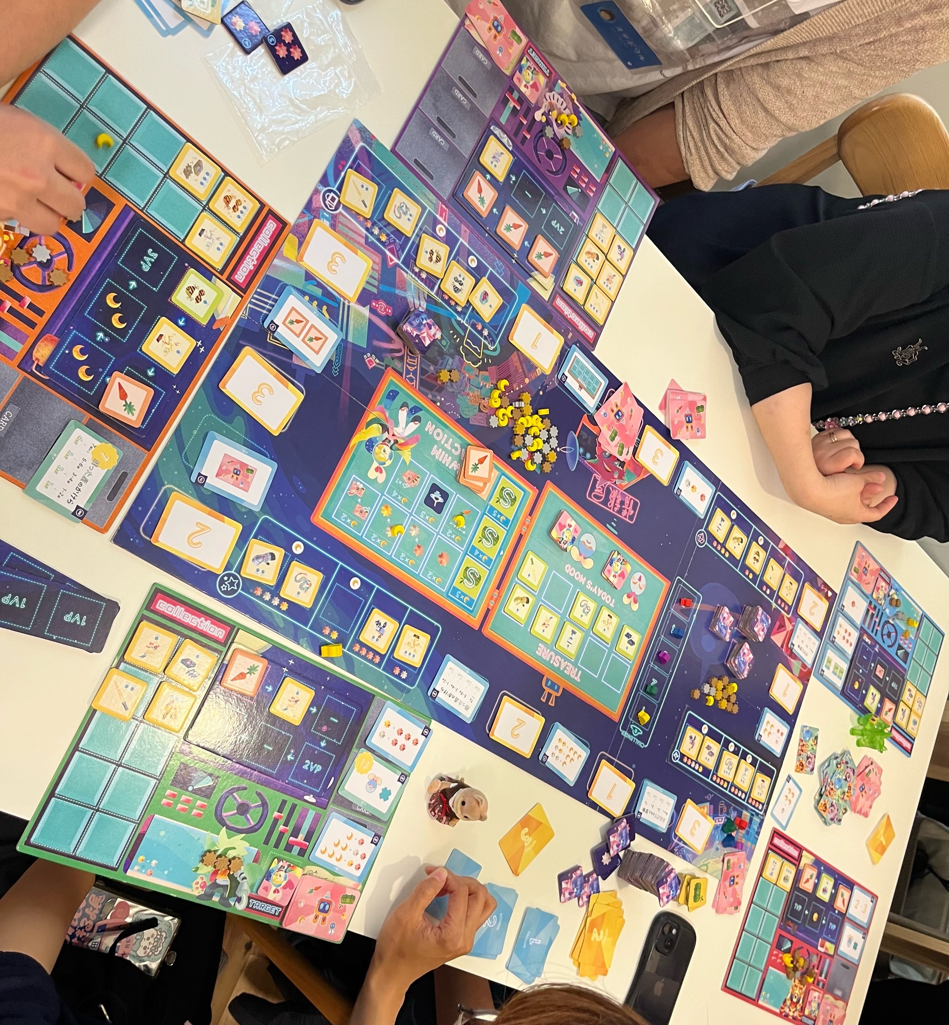 机の上にメインボードを広げ、木駒を動かし、タイルやカードを獲得するなど、ドイツのボードゲームを意識しました。