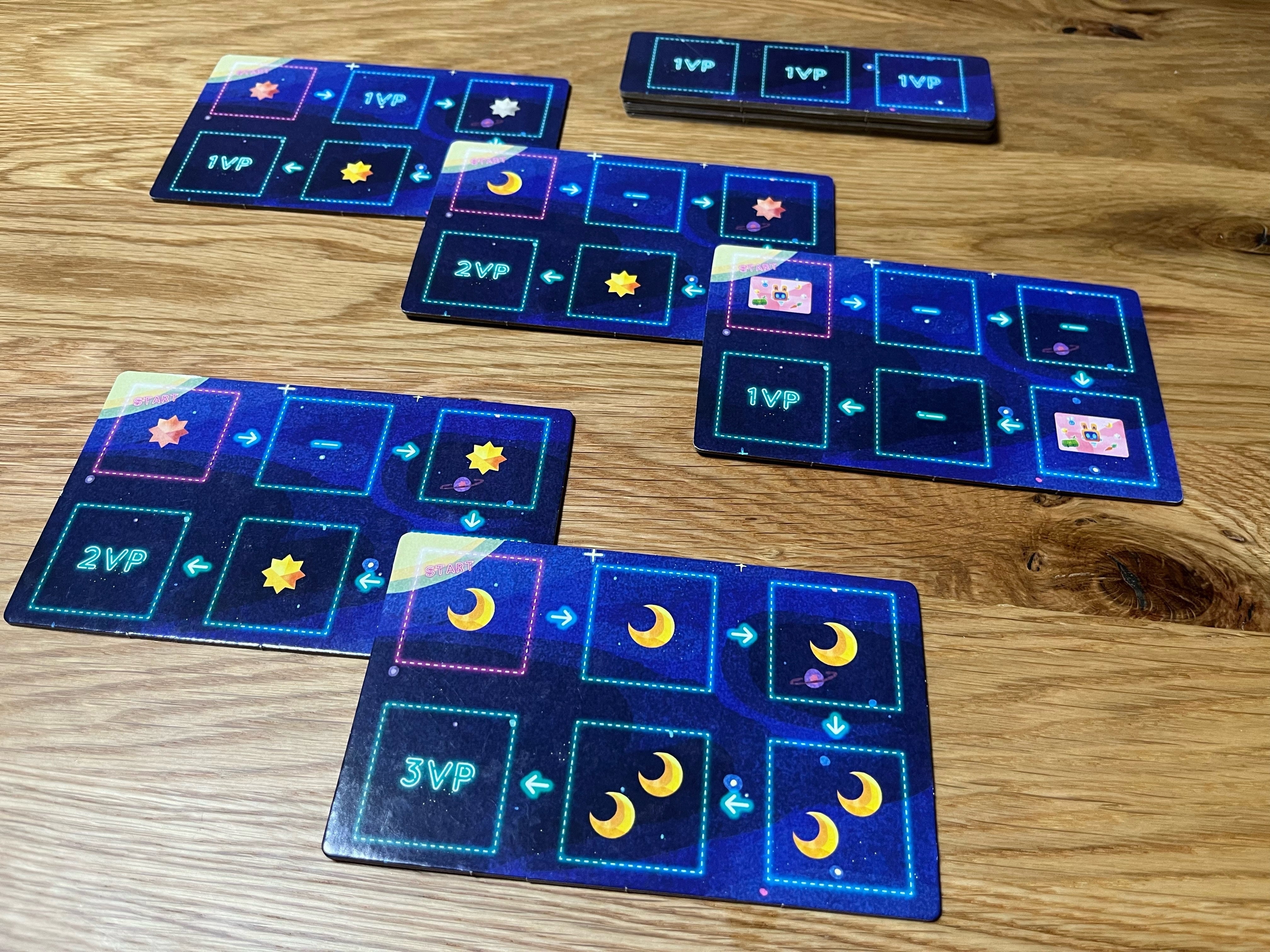 各プレイヤーは月をスタート地点として時計回りに宇宙船駒を進めていきますが、このゲームは進む歩数に制限がありません。どれだけ先に進んでも構いません。資源や宝物は有限ですので、欲しい資源や宝物などがあれば相手に取られる前に行かなければなりません。但し、一旦進むと戻ることができない一方通行となっており、進み過ぎると損をしてしまう可能性もあります。周りのプレイヤーの動きを見ながらどのくらい進むと良いかを判断したり、駆け引きをしたり、単純なのに悩ましくなっております。