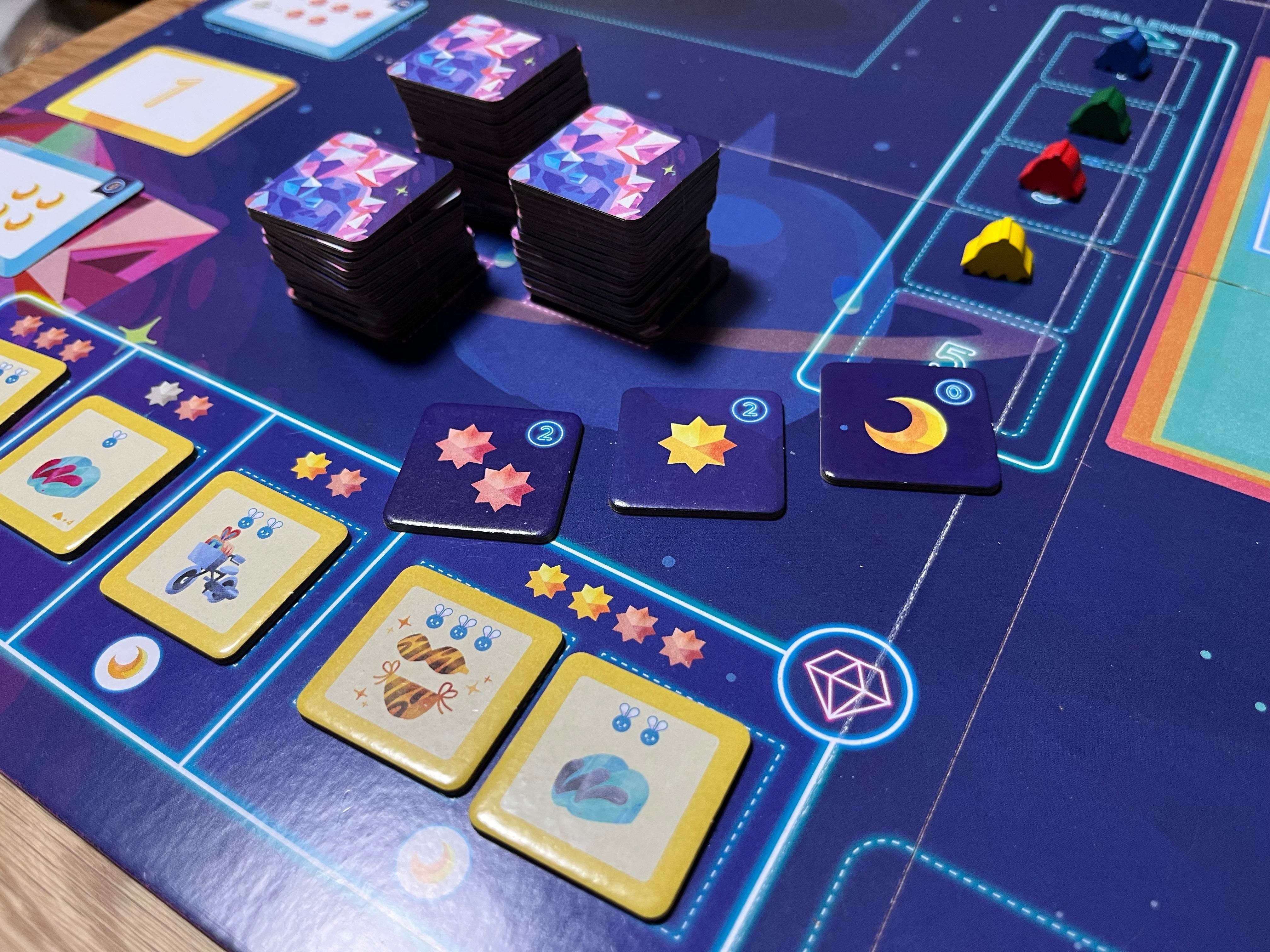 ボードに置かれている探索カードを獲得し、探索タイルをめくることによって星のかけらを獲得できます。探索タイルには様々な星のかけらやその他の資源が書かれており、タイルをめくるまで何が手に入るかわからないガチャ感を味わえます。