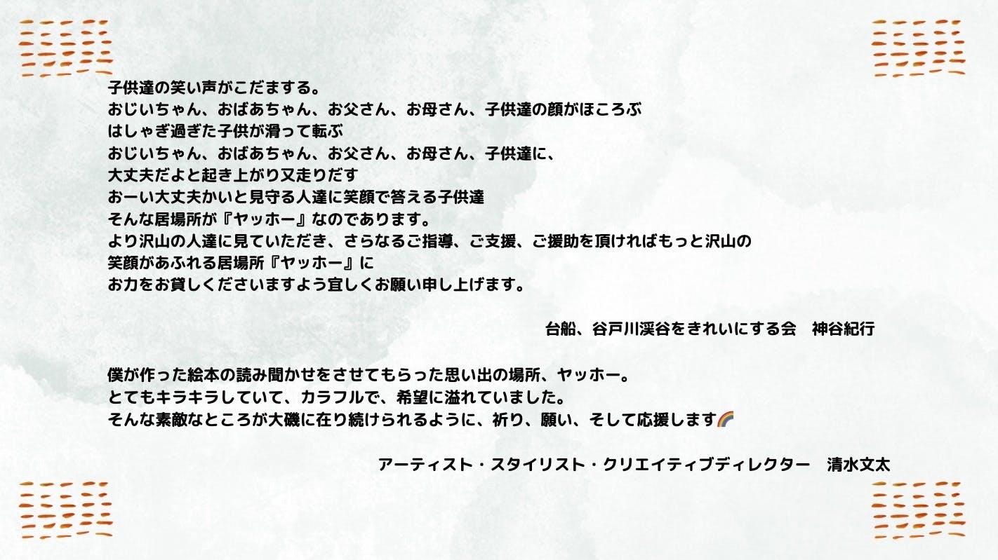 2024/07/29 21:14やったー、やりました!!!本日、無事に目標達成することができました。これもひとえに、みなさんの熱い声援、ご支援のお陰です。本当に、本当に、心からの感謝を申し上げます。ヤッホーのために、こどもたちのために、熱い夏をともに駆け抜けてくださって、ありがとうございました。残り2日、とにもかくにも、この勢いのまま、走り切ります。最後まで、伴走よろしくお願い致します。夏休みのこどもたち、親たちからの熱い要望を受けて、7/31から新しくはじめる「夏休みヤッホー(日中の居場所)」には、初日から20人を超えるこどもたちから参加の申し込みがありました。どう過ごそうか、お昼ご飯はみんなでどうつくろうか、食材はどうしようか、すべては手探りですが、みなさんの支援や心強いメッセージを胸に、こどもたちと試行錯誤を楽しみながら歩みを進めていってみたいと思います。 もっと見る