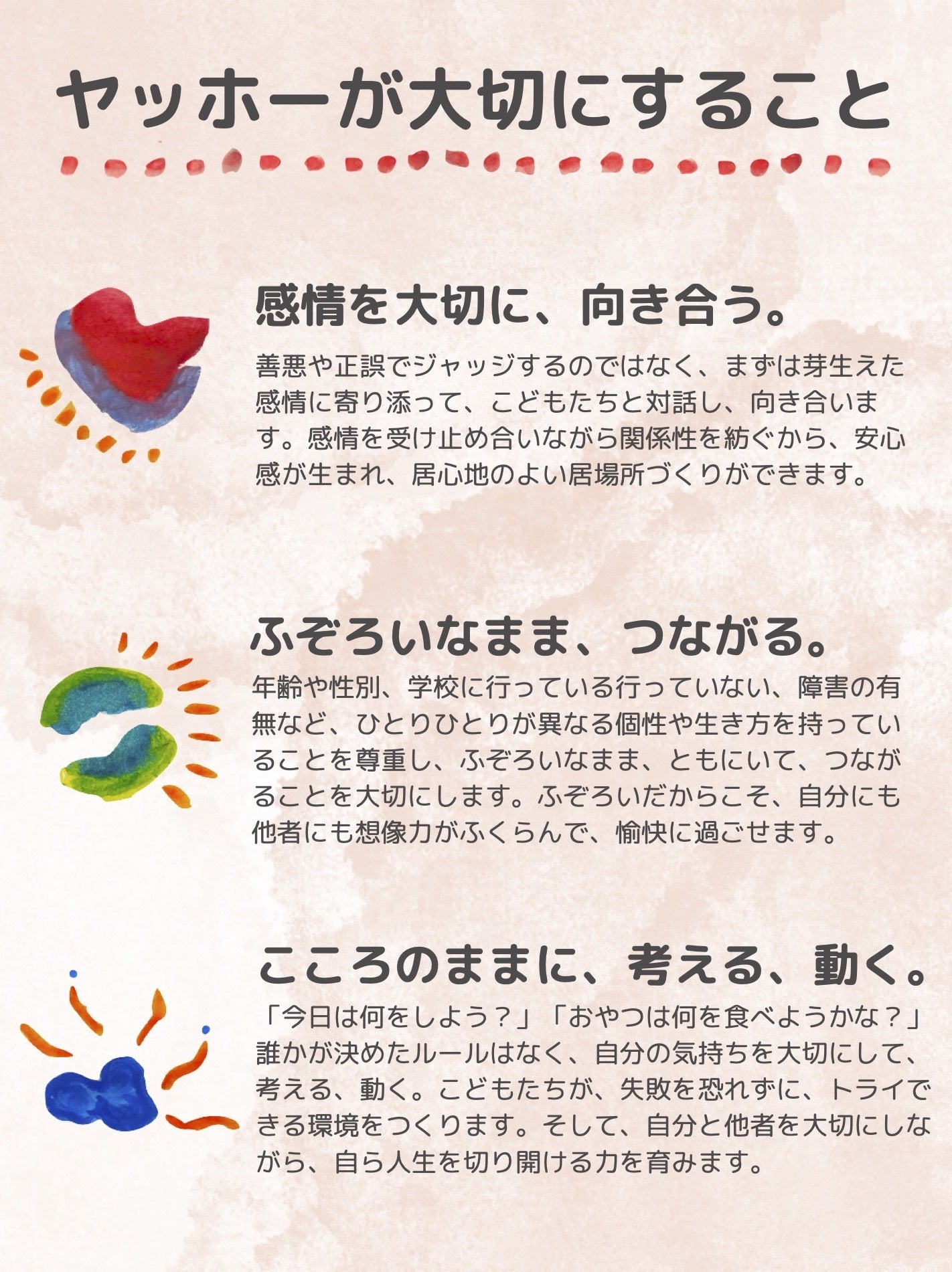 「ヤッホー」は、こどもを真ん中に、町のみんなが支え合い、つながり合い、自然と力を合わせて、ともに未来に希望を見出せるようなコミュニティを育んでいきます。