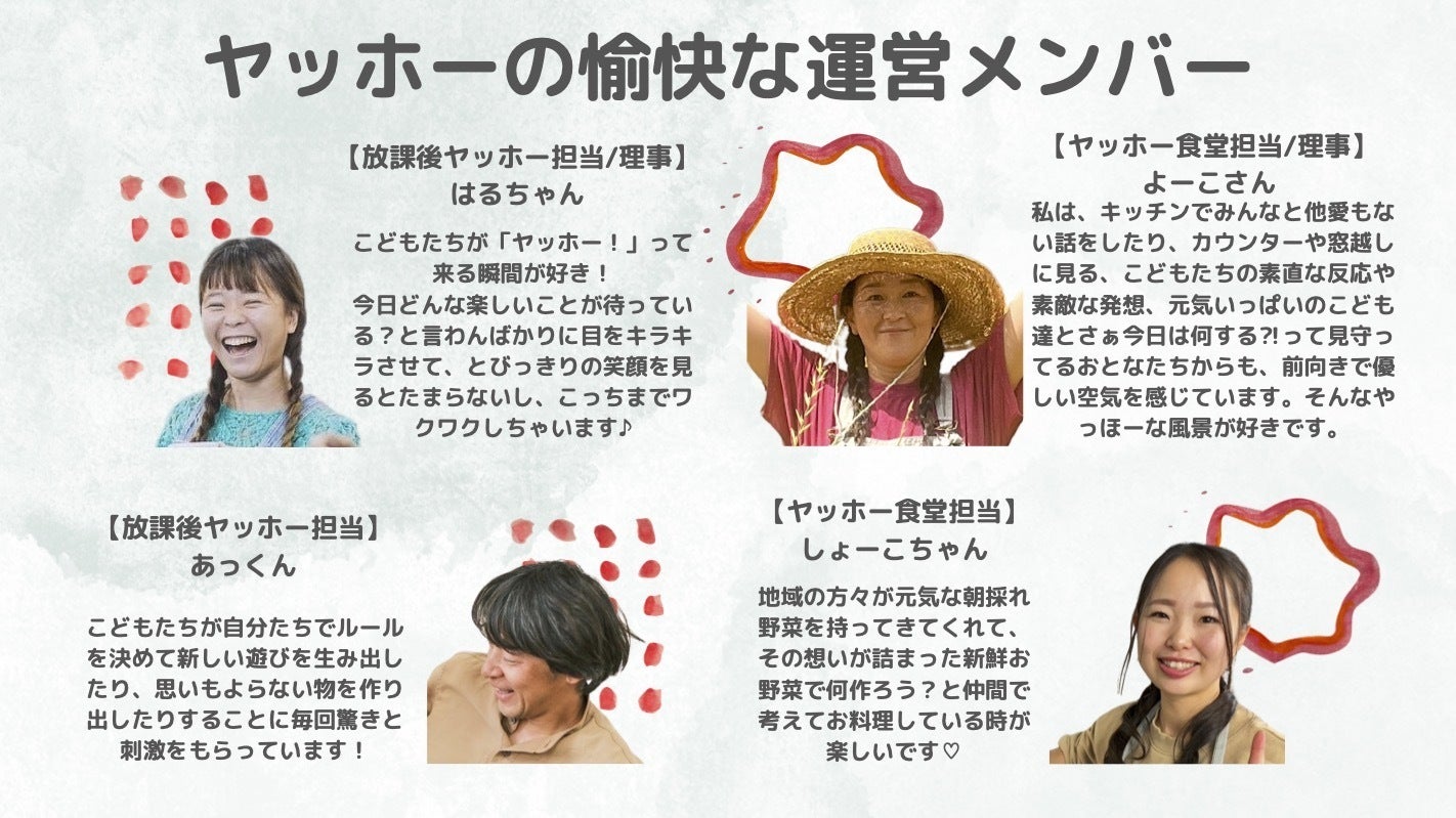 温かくこどもや親、地域のひとたちを受け入れて、個性や特技をいかして、わくわくする関係性を紡いでいける、そんなひとたちがヤッホーの運営メンバーに集まっています。