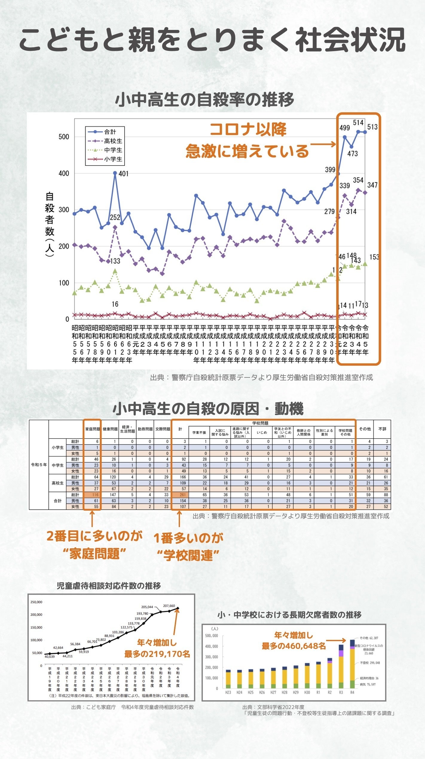 こどもたちには、ピカピカの笑顔で、のびのびと日々を過ごしてもらいたいと思う一方、不登校の増加、児童虐待の増加、自殺率の増加、経済情勢の悪化など、こどもと親をとりまく社会状況は厳しさを増しています。