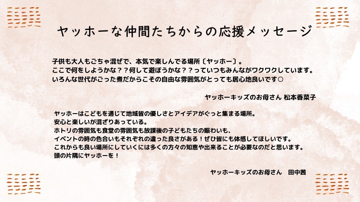 ほとり、ヤッホー食堂、放課後ヤッホーすべての側面において、ともにこどもや地域の課題に向き合い、支え合う仲間ともっと出会いたい、もっと関わりを深めたい、そう思い、クラウドファンディングに挑戦しています。