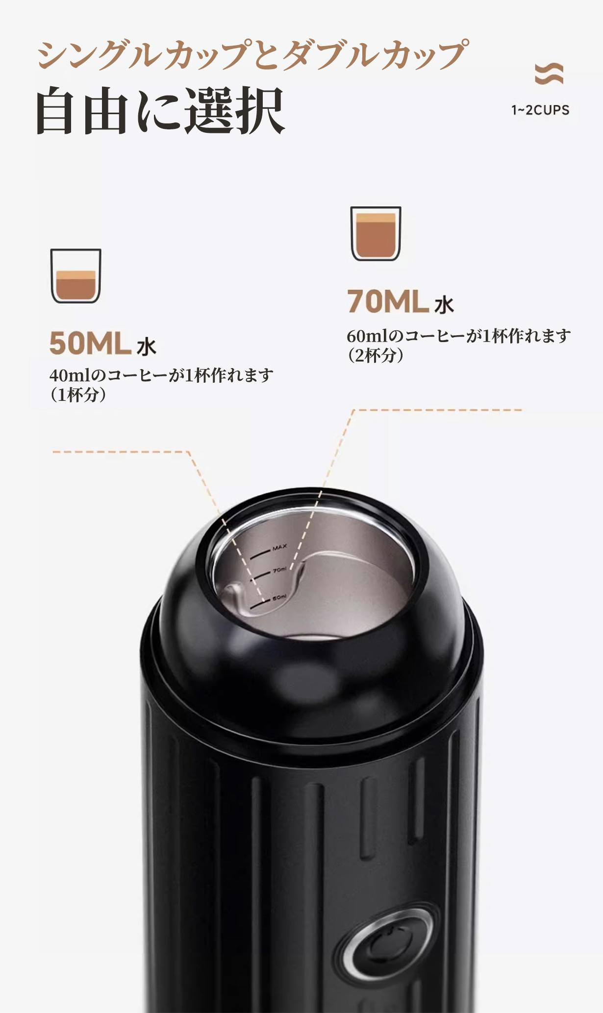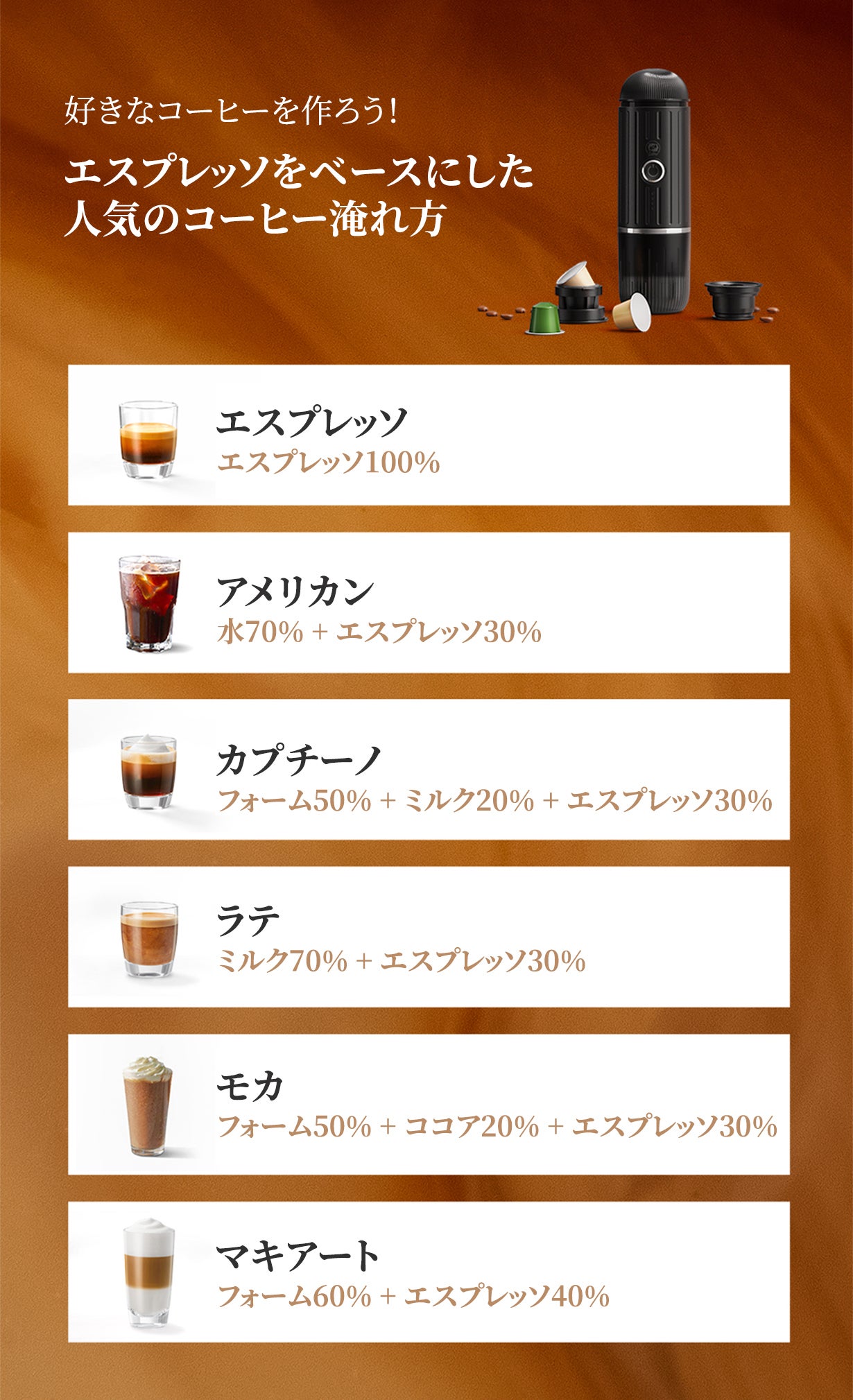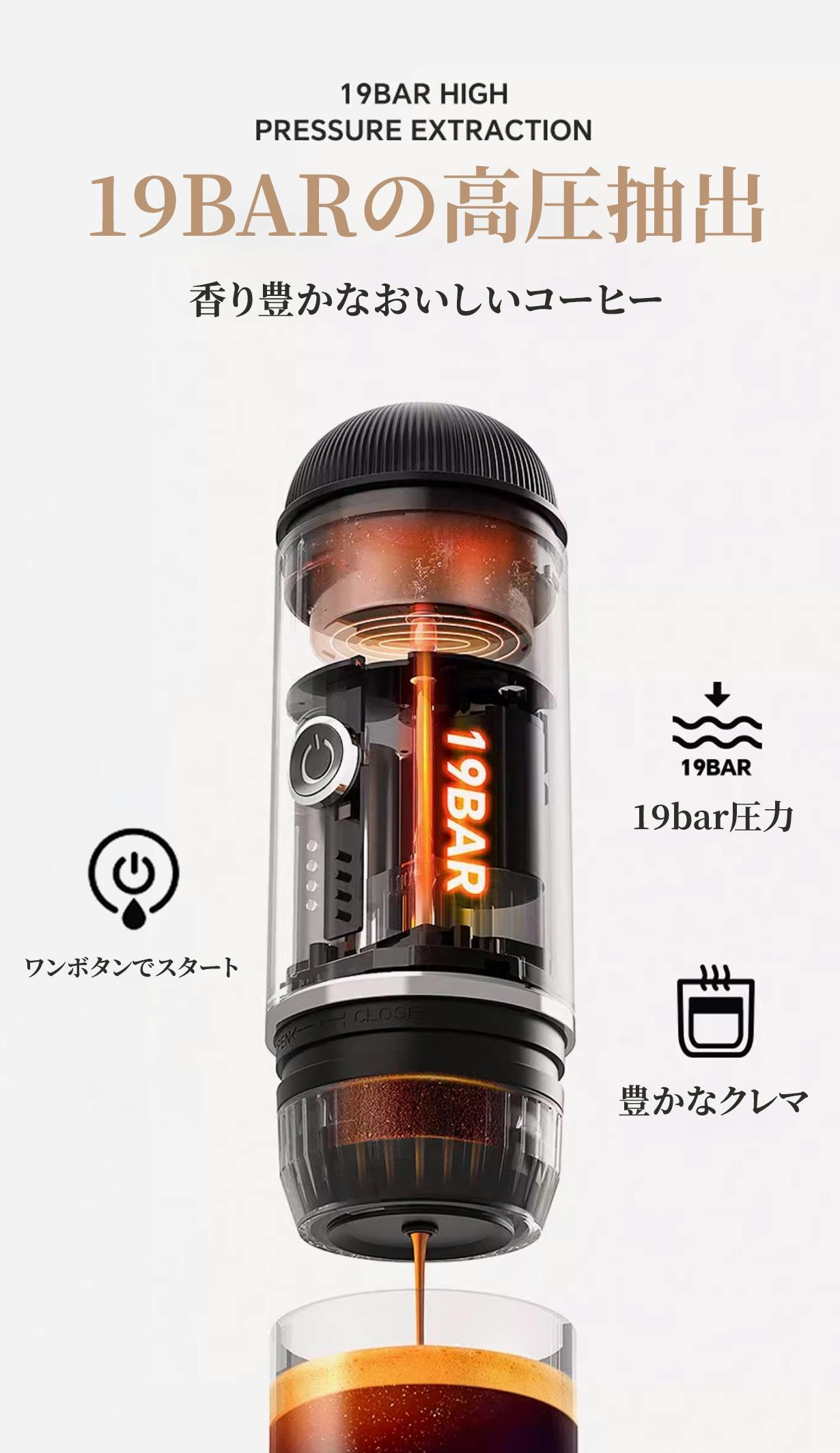 今こそ、携帯型エスプレッソマシンで、どこにいても極上のコーヒーをお楽しみください。毎日の生活に豊かな味わいとスタイルを加えるための完璧な選択です。ご自身へのご褒美に、または大切な人へのプレゼントにも最適です。