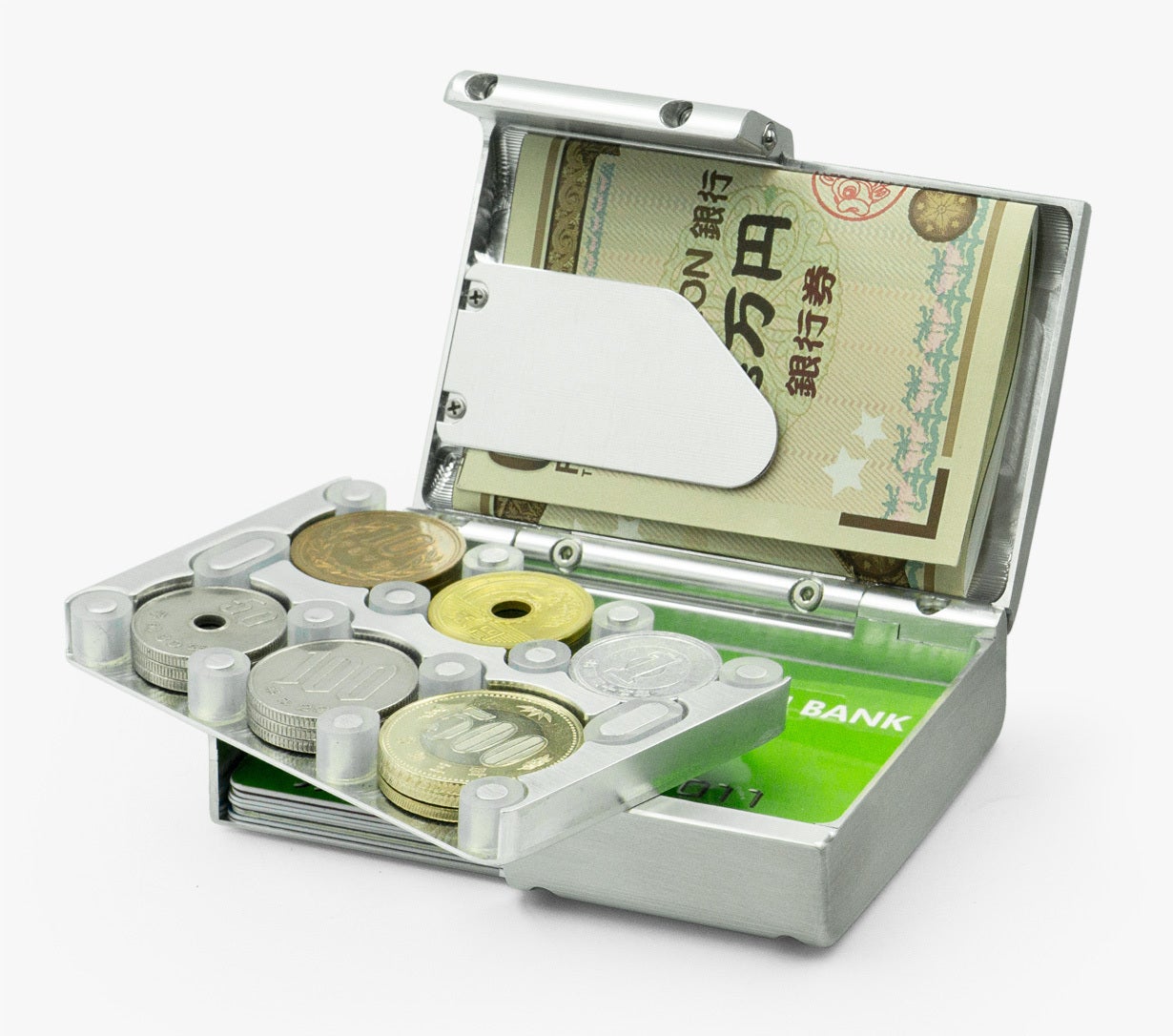 コインホルダーは、自由に取り外しできるので、カード類の下に入れることもできます。